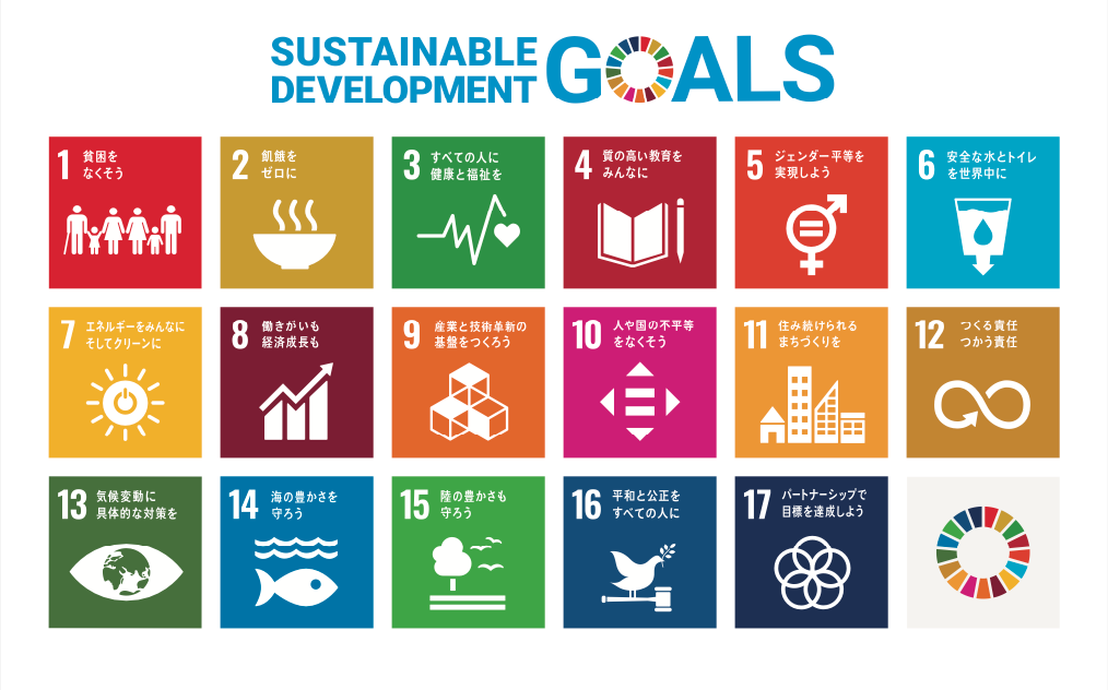 2015年9月の国連サミットで決められた、持続可能な世界を実現するための、地球上の誰ひとり取り残さないことを目指し、すべての国において2030年までに達成すべき国際社会共通の目標です。