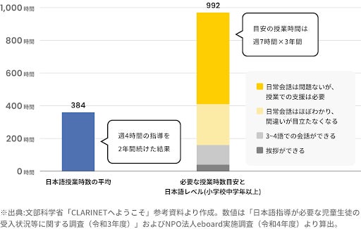 日本語指導が必要な児童・生徒に対しては、学校に入る前の教育委員会等による専門的な日本語の初期指導や、入学後の通常学級とは別で行われる指導(いわゆる「取り出し指導」)などが自治体ごとに行われていますがが、eboardがベネッセこども基金の支援を受けて行ったアンケート調査では、1人あたりの日本語指導にかかる総時間数は、平均すると「週4時間の指導が2年間」ほどにとどまっていることが明らかになりました。
