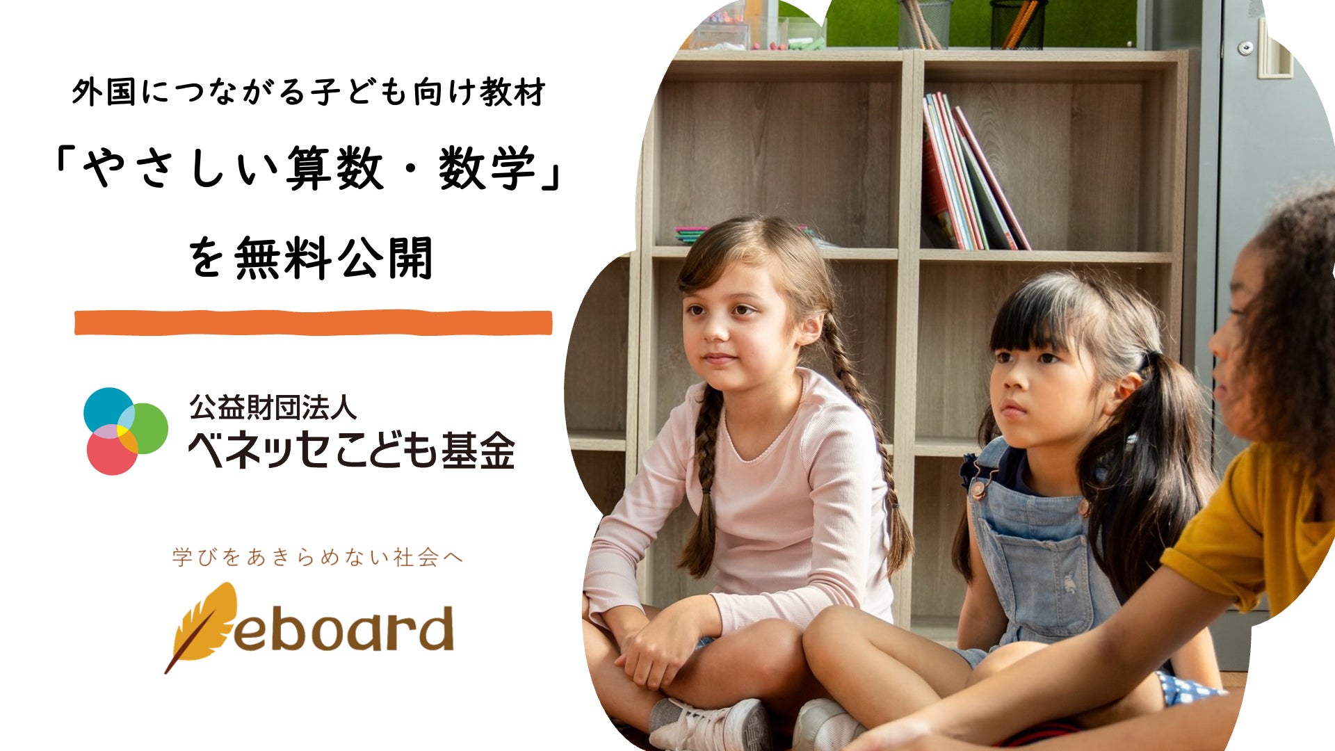 NPO法人eboardは、外国につながりがあり、日本語支援を必要とする子どもたちを主な対象に、できる限り言語情報を減らしながら、教科概念の習得を目指した新しい教材「やさしい算数・やさしい数学」を作成、公開しました。この教材は、開発公益財団法人ベネッセこども基金の「2022年度 経済的困難を抱える子どもの学び支援活動助成」の支援を受けて作成されています。