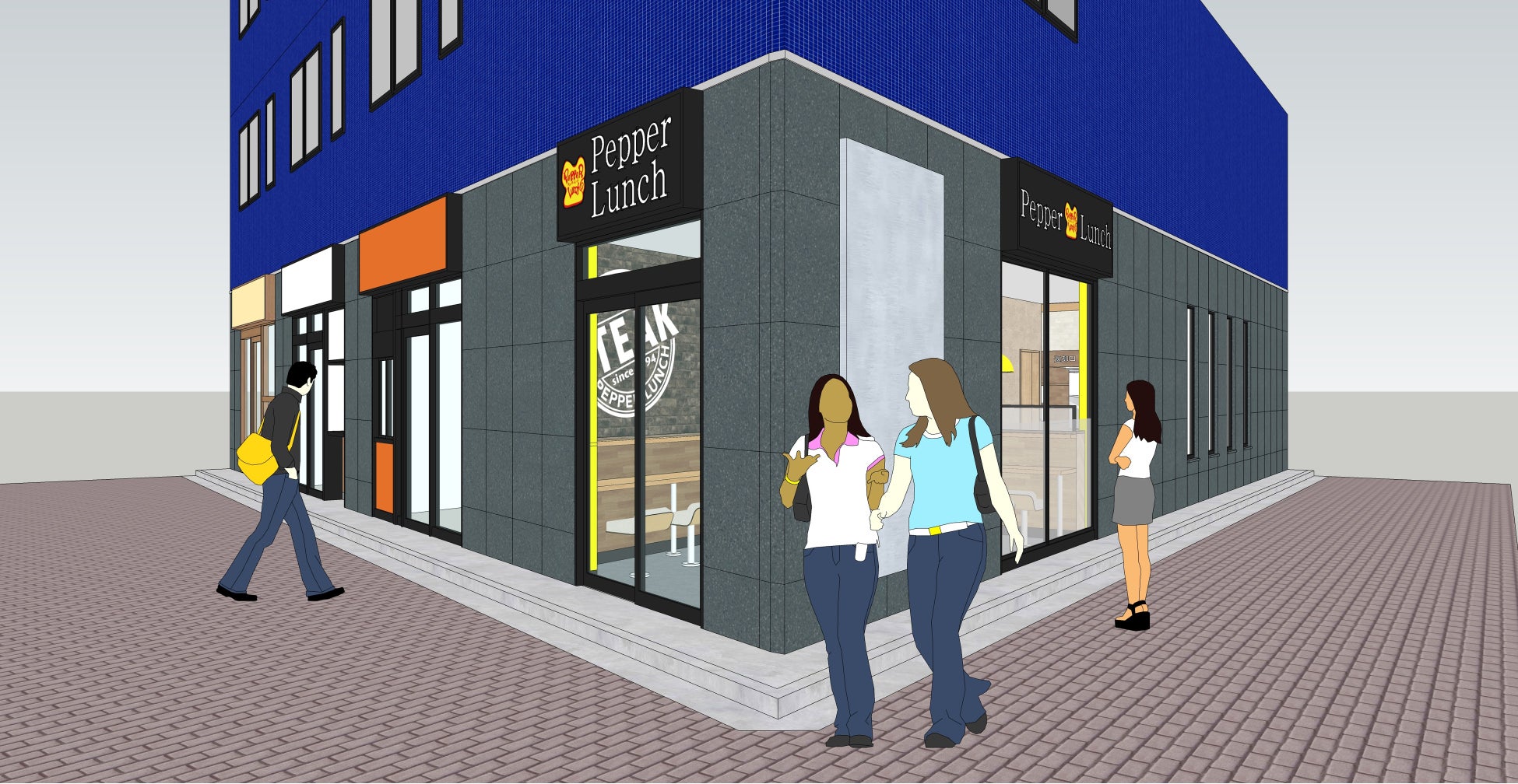◆「ペッパーランチ フレンテ明大前店」では黄色を基調とした学生の街らしいPOPな新デザインを採用。