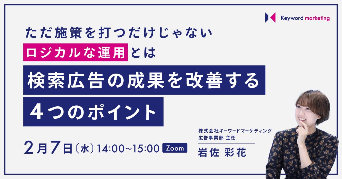 株式会社ベクトル(本社:東京都港区、代表取締役会長兼社長:西江 肇司、東証プライム:6058)の子会社である株式会社キーワードマーケティング(本社:東京都中央区、代表取締役:滝井 秀典)は、無料オンラインセミナー『ただ施策を打つだけじゃないロジカルな運用とは 検索広告の成果を改善する4つのポイント』を2月7日(水)14時より開催します。
