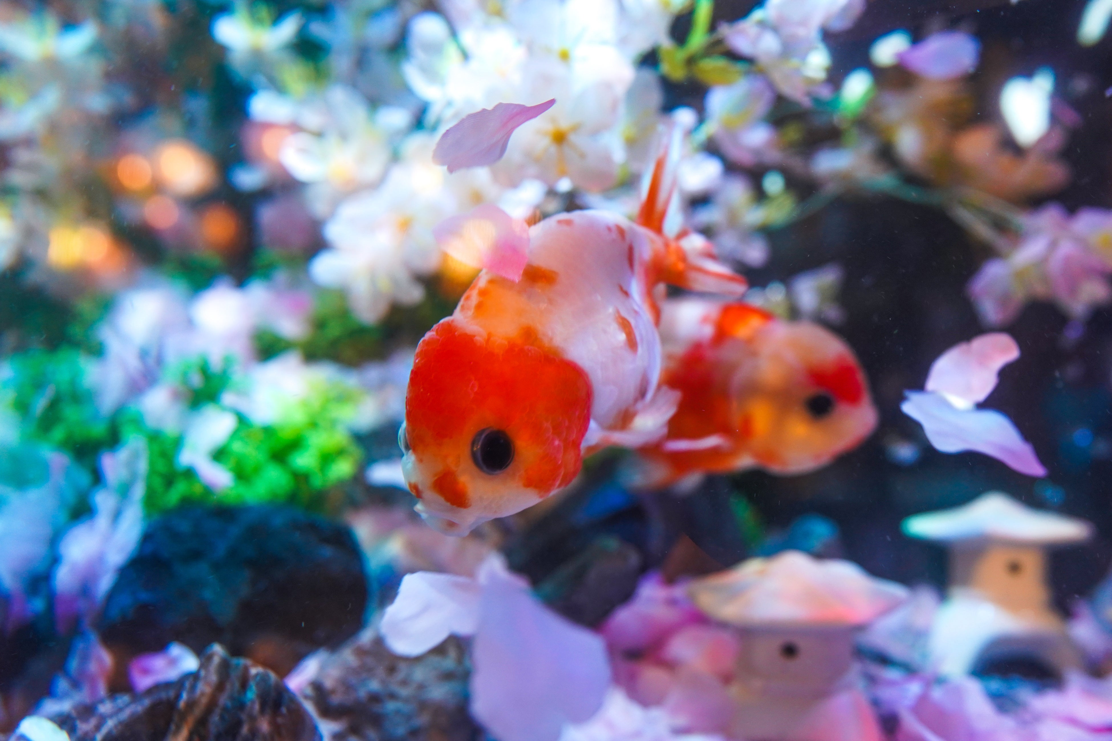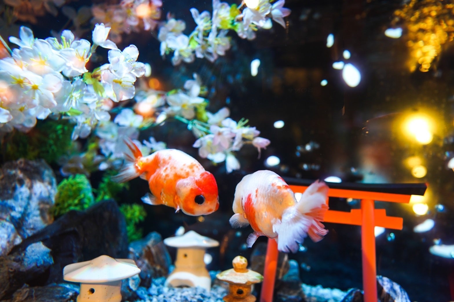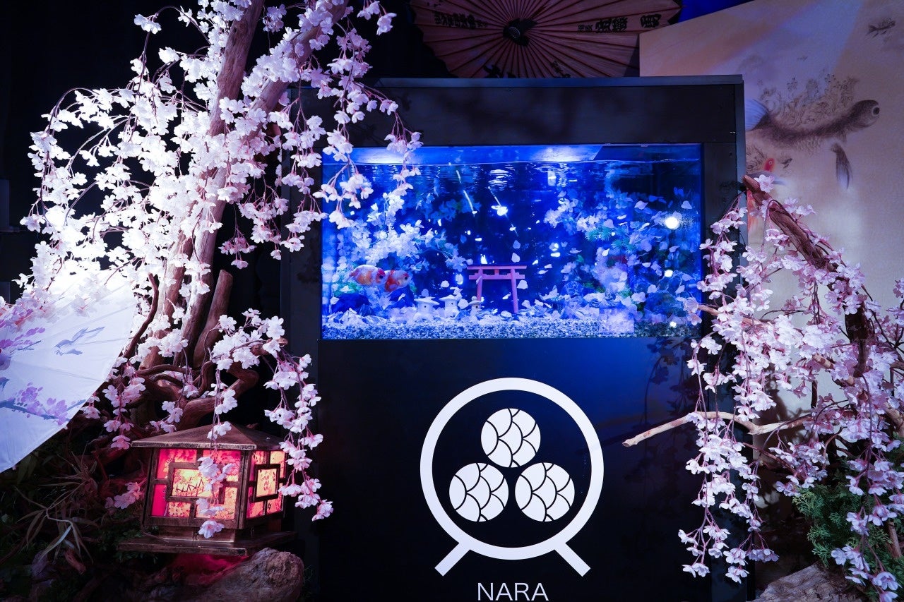 奈良金魚ミュージアム 水中を舞う桜と金魚が織りなす新しい春の風物詩 桜が名前の由来となった金魚と356本の桜の木が装飾された「さくら咲くらんちゅう」が開催