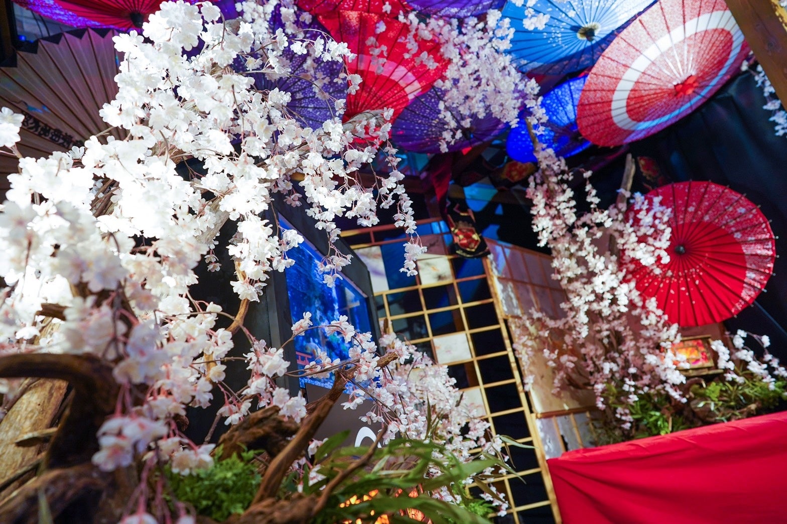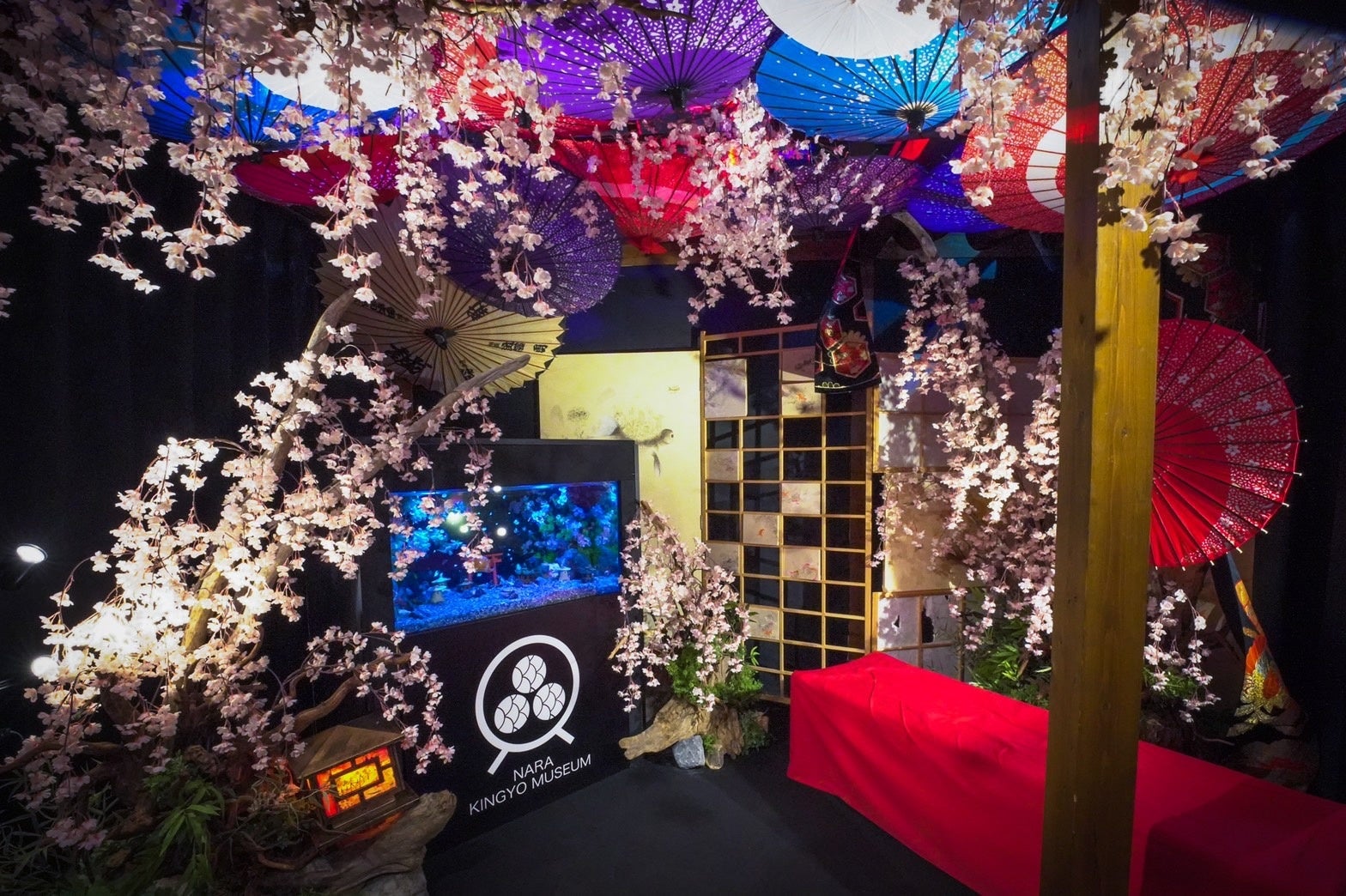 奈良金魚ミュージアムでは、年に4回季節ごとに装飾の変更を行っています。今回は2022年4月の桜のお花見シーズンに合わせ、桜が名前の由来の金魚「桜錦」の展示と、造花の桜の木356本を館内装飾に使用したイベントを開催します。