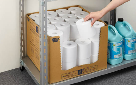 保管棚に箱ごと置いて開口部からさっと取り出せるトイレットペーパー。使うたびに段ボールを棚から下ろし