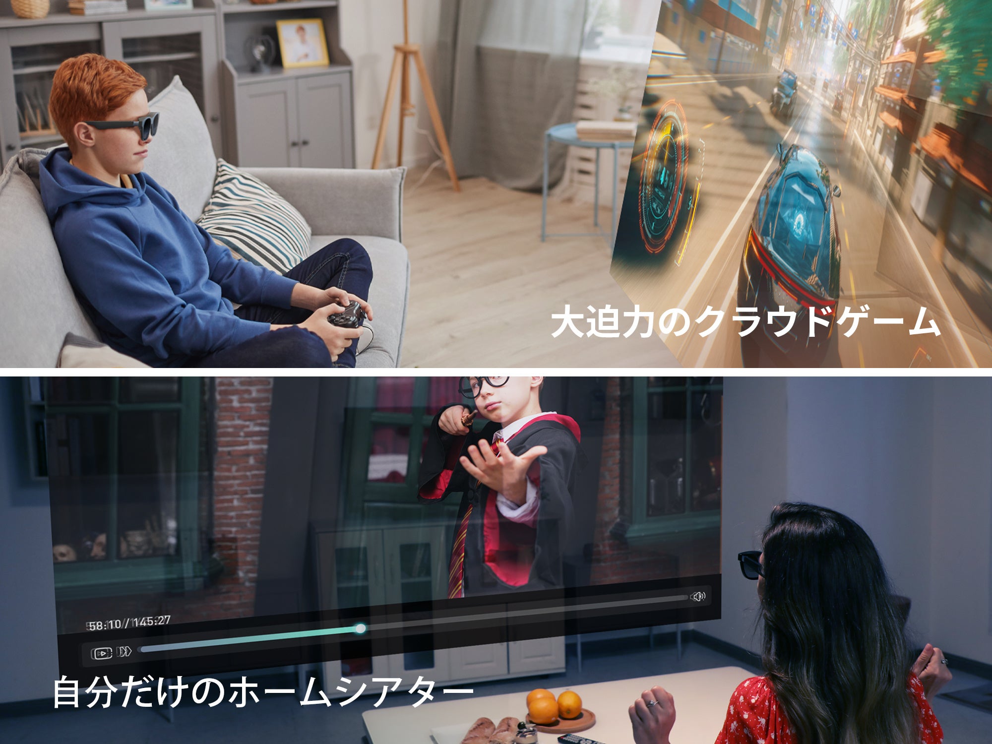 また、一般的なVRグラスの約2倍のシャープさを実現し、繊細で光沢のある画質で、さらに、最大201インチのシアター級の巨大スクリーン(ARグラス越しに4mで130インチ、6mで201インチに相当)で映像をお楽しみいただくことができます。