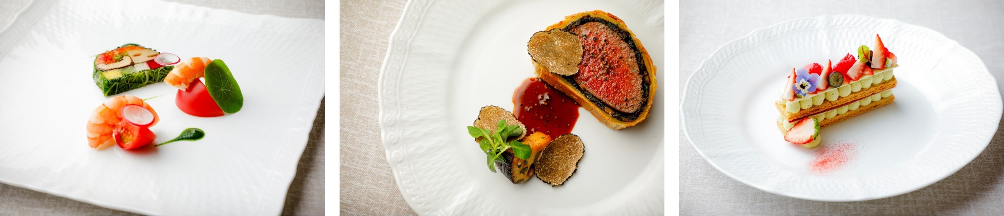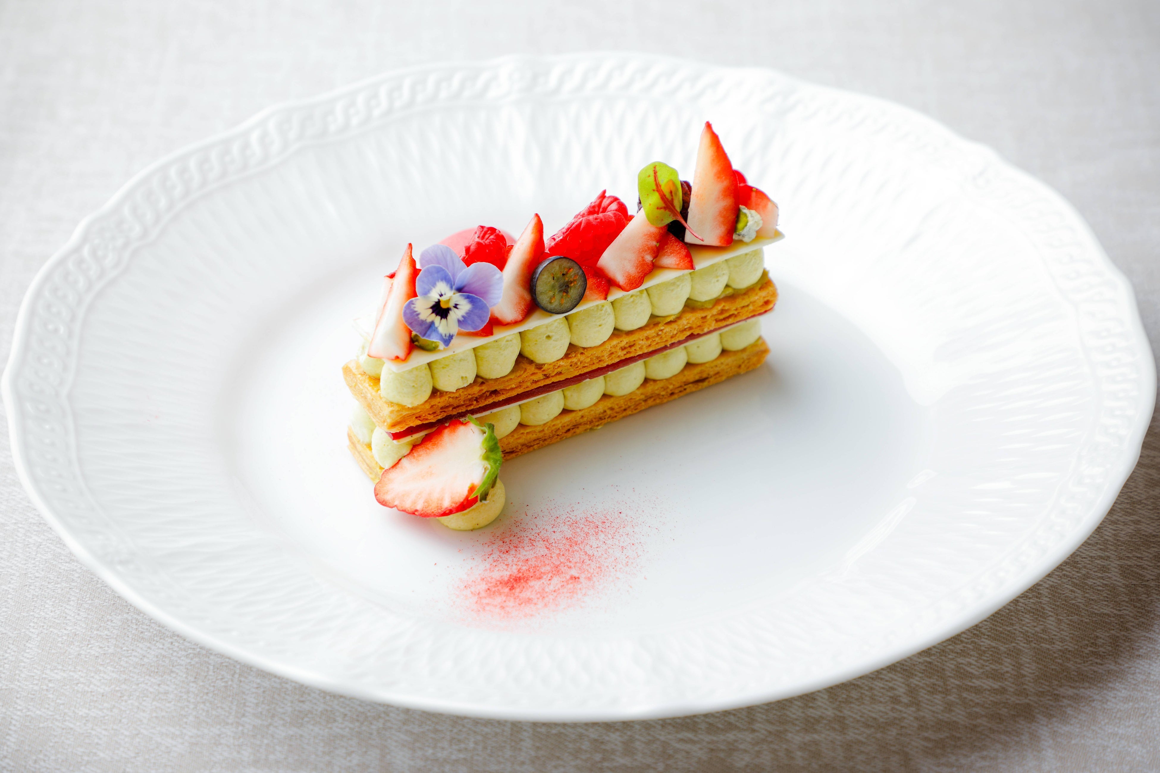 ■近江牛のウェリントン 天恵菇椎茸 マデラワインソース 近江牛テンダーロインとマッシュルームのペーストをサクサクのパイ生地で包み込んでミディアムレアに焼き上げ、付け合わせには入手困難なプレミアム椎茸、天恵菇のソテーを合わせた香り豊かな一品です。 ■あざといちごとイタリア産ピスタチオのミルフィーユ ラズベリーのソルベ 京都府 久御山産の完熟「あざといちご」とピスタチオの滑らかなクリームを練りこんだホワイトチョコレートのミルフィーユ、苺の甘酸っぱさとコクのあるピスタチオの絶妙のコンビネーションをご堪能ください。 |