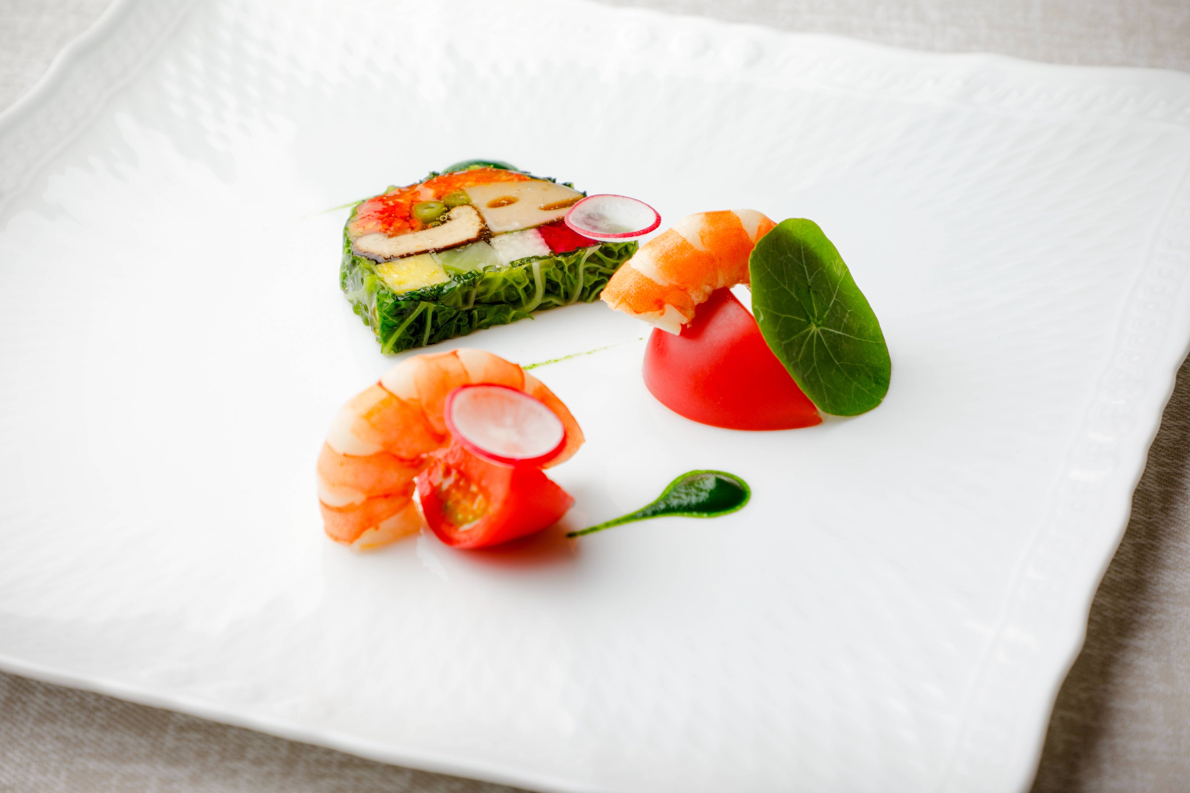 (前菜)車海老のポーチ 野菜のテリーヌ 生姜のヴィネグレット