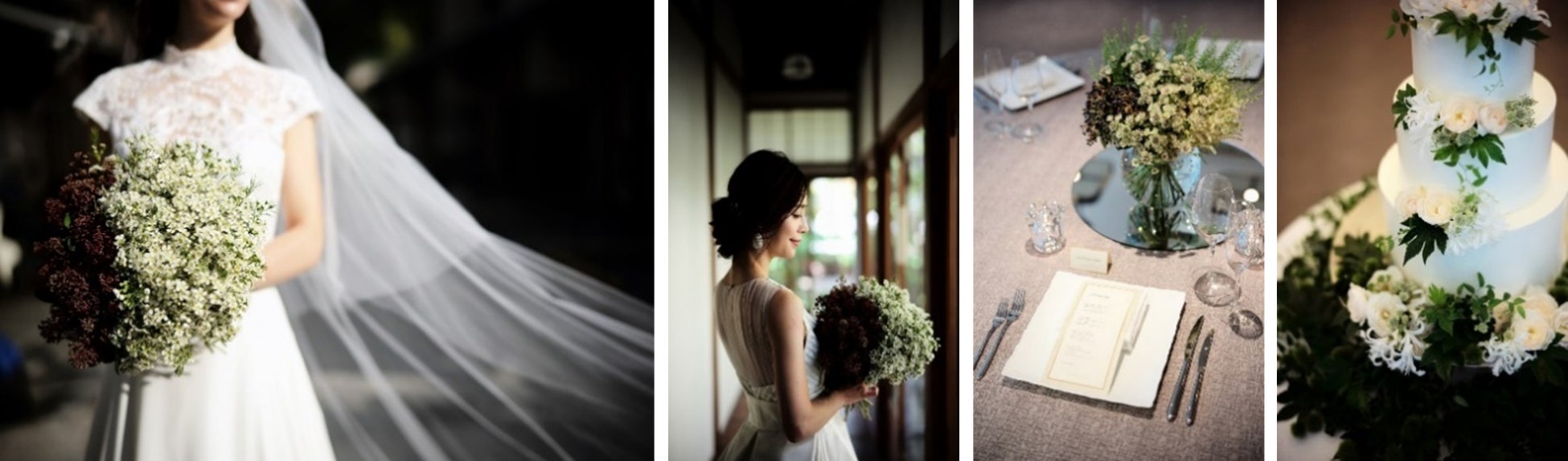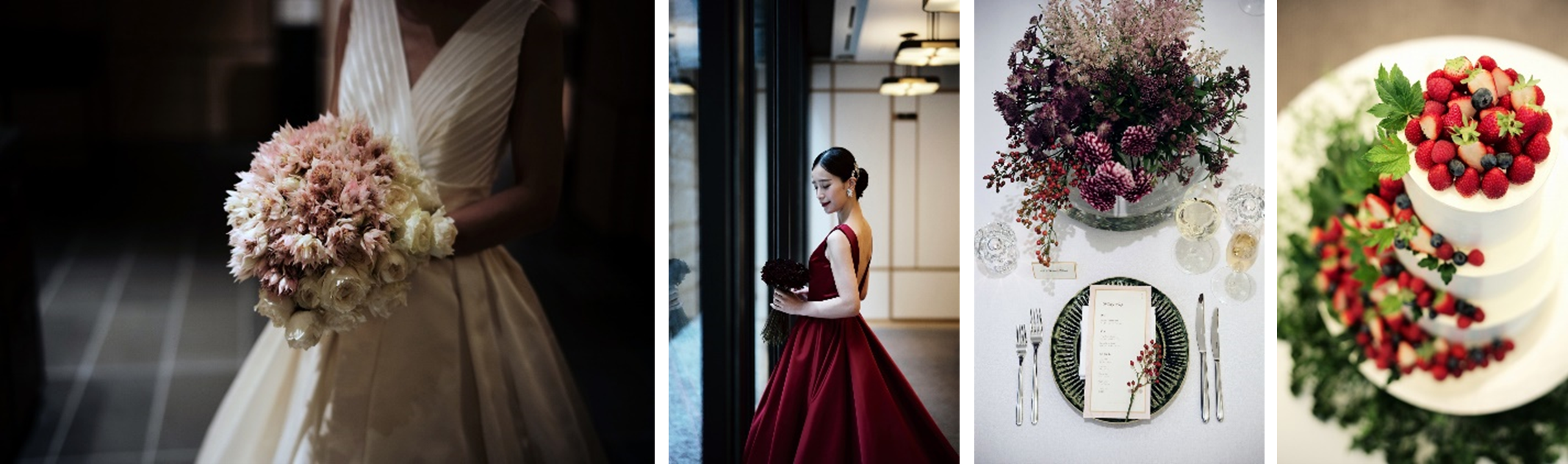 (左から) 「 雅 」 をイメージしたブーケ、ドレス、テーブルコーディネート、ウエディングケーキ)