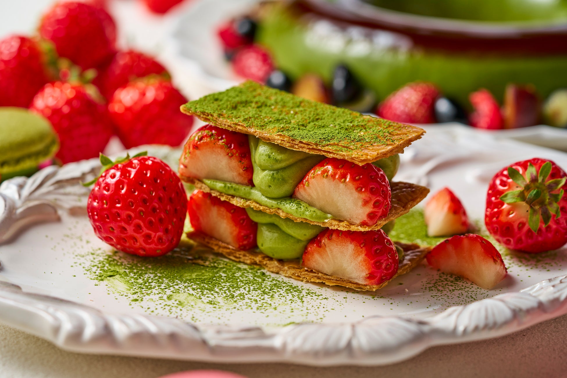 茶と黒豆のロールケーキ、抹茶と栗のモンブラン、抹茶と苺のミルフィーユなど、抹茶の深みと苺の甘