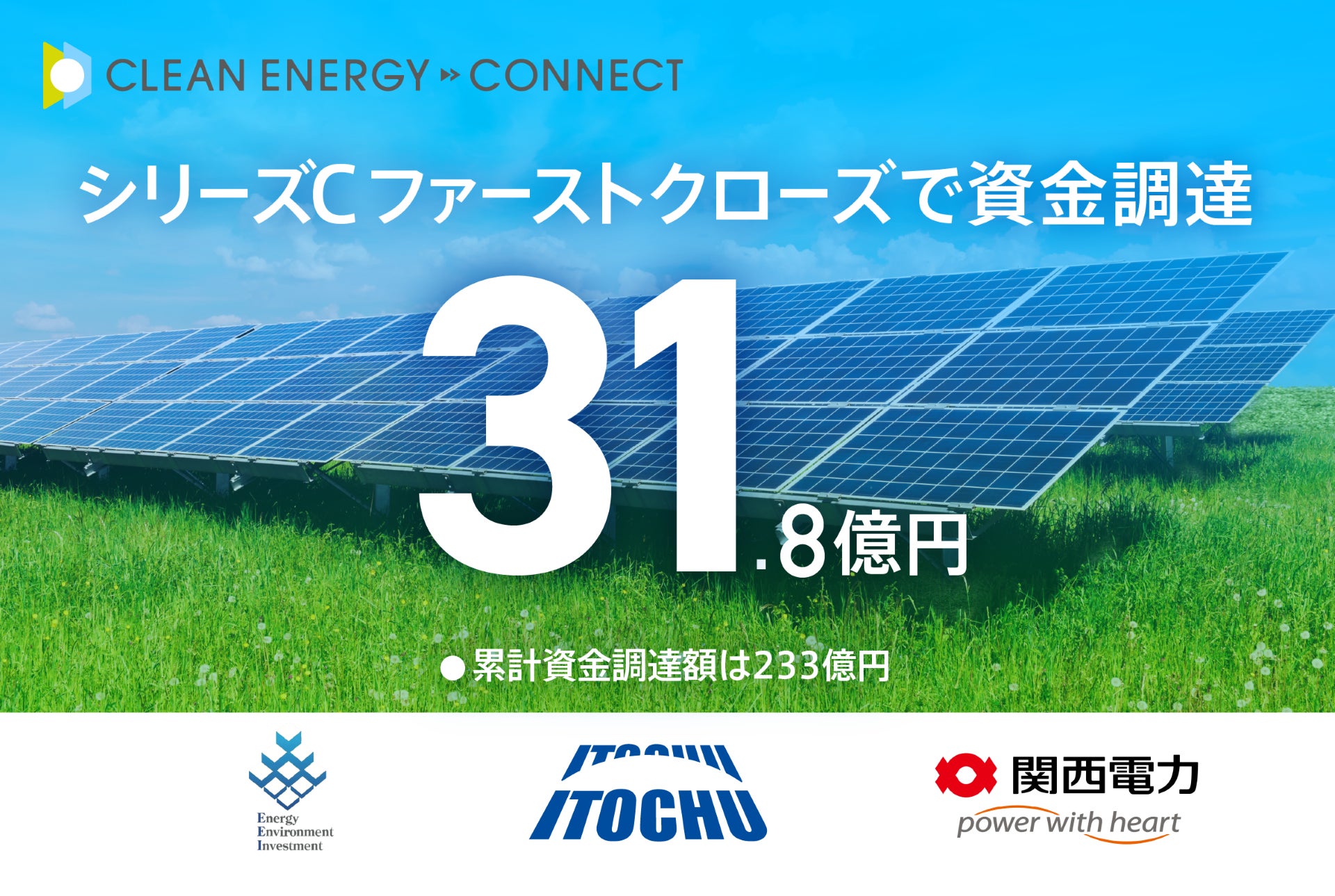 脱炭素経営企業、RE100参加企業等のお客様に対してNon-FIT太陽光発電によるグリーン電力と環境価値をお届けする株式会社クリーンエナジーコネクト(代表取締役:内田鉄平、以下「クリーンエナジーコネクト」)は、シリーズCファーストクローズ資金調達において、株式会社環境エネルギー投資(EEI4号イノベーション&インパクト投資事業有限責任組合)、伊藤忠商事株式会社、関西電力株式会社を引受先とする第三者割当増資等により総額31.8億円の資金調達を実施しました。
