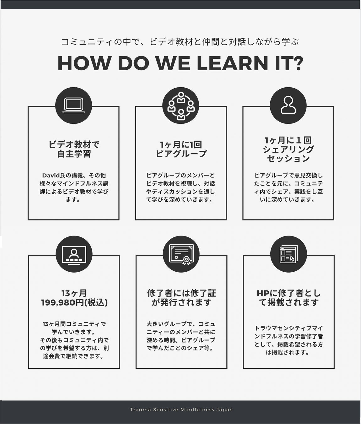 今回のセッションでは、より深く学びたい方に向け、トラウマ・センシティブ・マインドフルネス1年コースの紹介も行います。