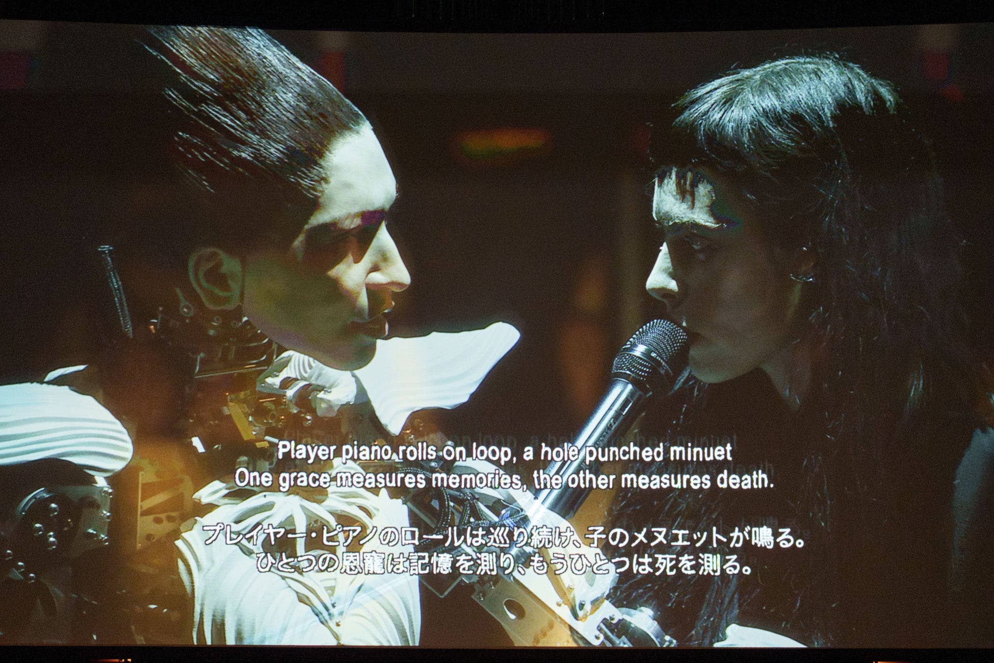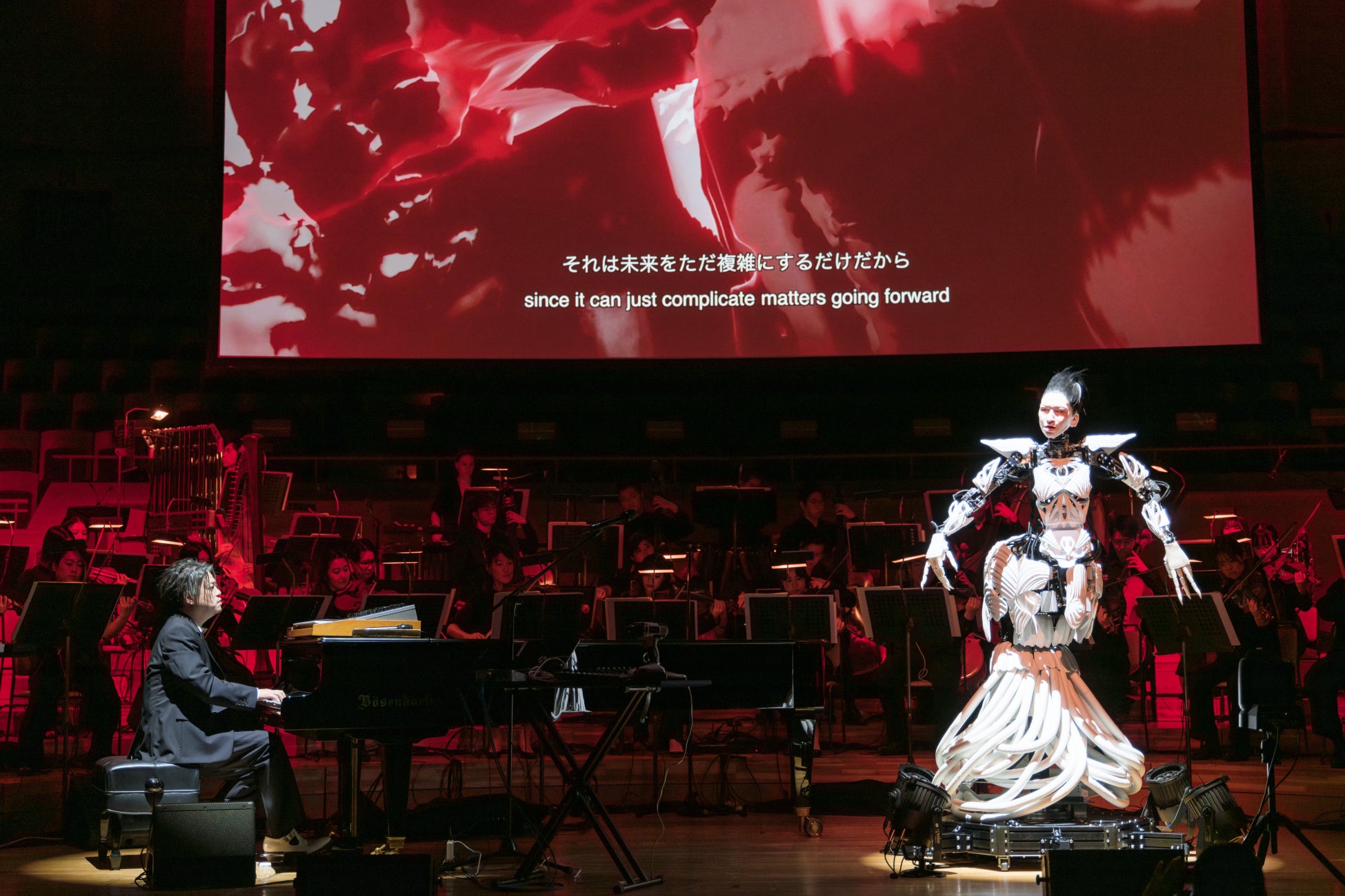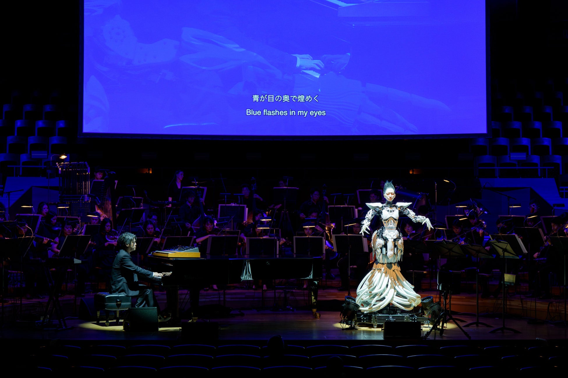 そしてアンコールでは、渋谷が2008年に妻マリアの死をきっかけに作曲した『for maria』を今回のためにピアノとアンドロイド・マリアのヴォーカルのためにアレンジしたバージョンで演奏。 ステージには渋谷とアンドロイド・マリアにだけ灯りが落ち、繊細なピアノの音色とマリアの声が優しく重なり合う。ひとつひとつの音が祈りのようにホールに響く中、アンドロイド・マリアがゆっくりと顔を上げ、渋谷と向き合ってAIによって生成された詩を歌い始めた。