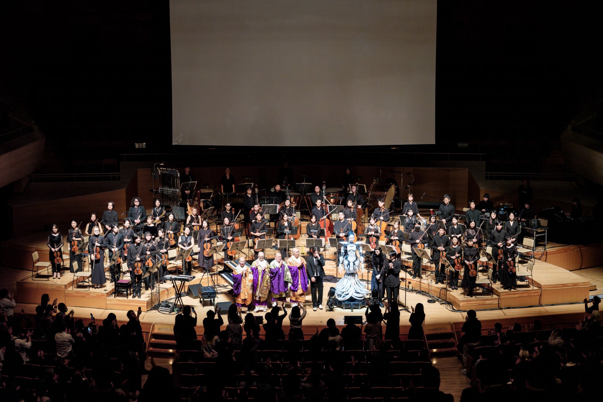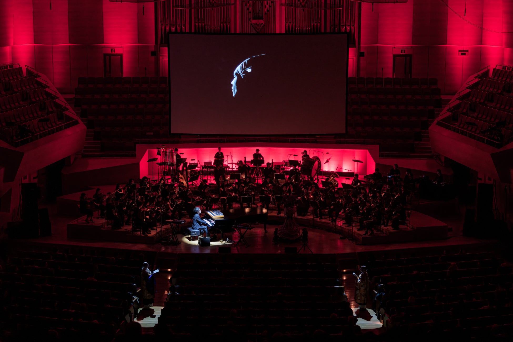 コンサートが開演し会場が暗転すると、渋谷のエレクトロニクスによる『Overture(序曲)』が始まり、客席後方から僧侶4名が声明を唱えながら入場。オーケストラによるコンサートの常識を覆す演出に観客は息を呑んだ。そこから連なる1曲目の『BORDERLINE』では、2階席に配置された金管楽器が鳴り響き、ファンファーレのようでもあり警報のようでもある咆哮がホール全体を包み込む。AIによる歌詞は「かつて愛したあの世界はもうあなたのものじゃない」と、この世界の終焉を予感させる一節で作品が始まる。
