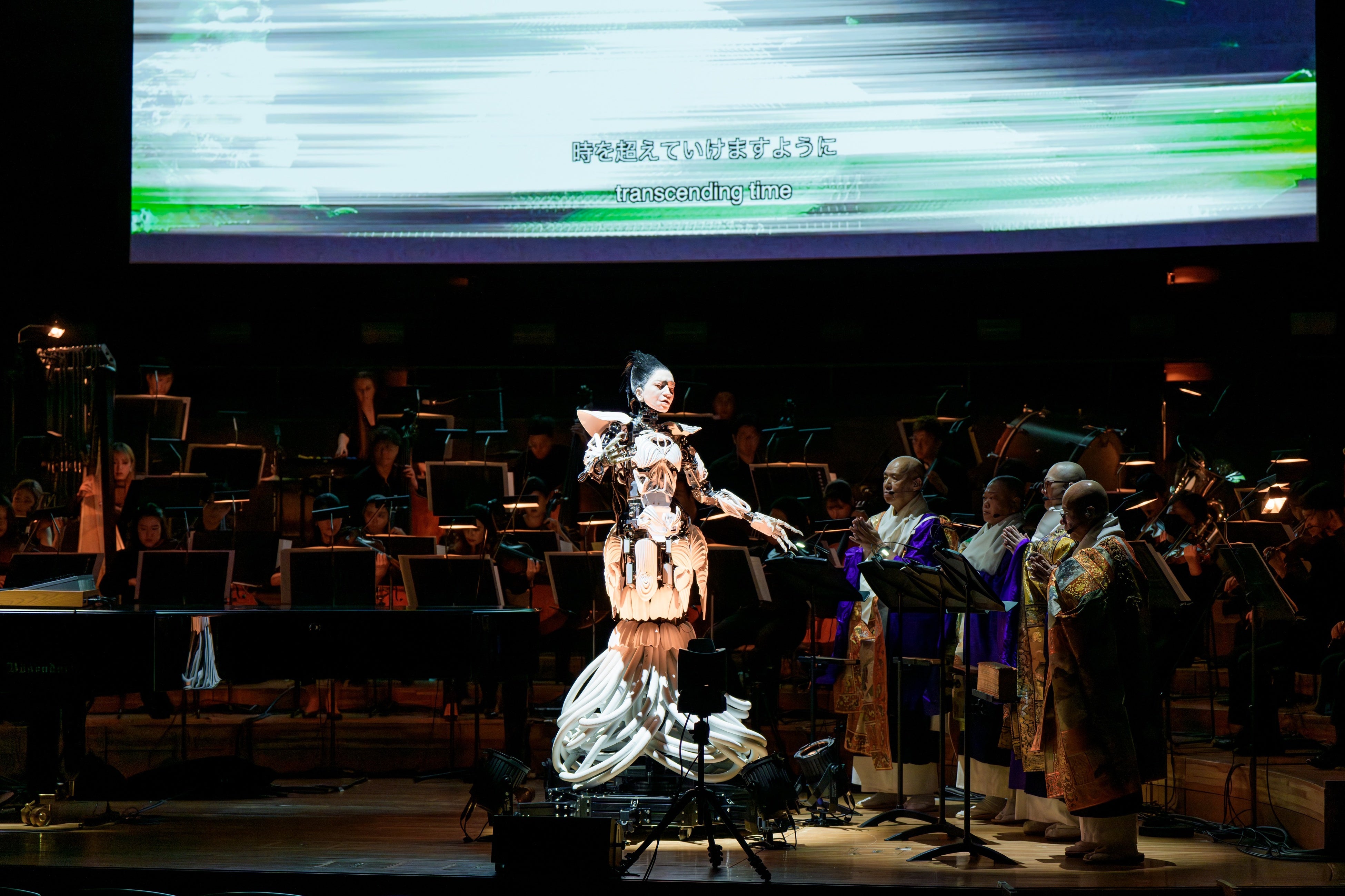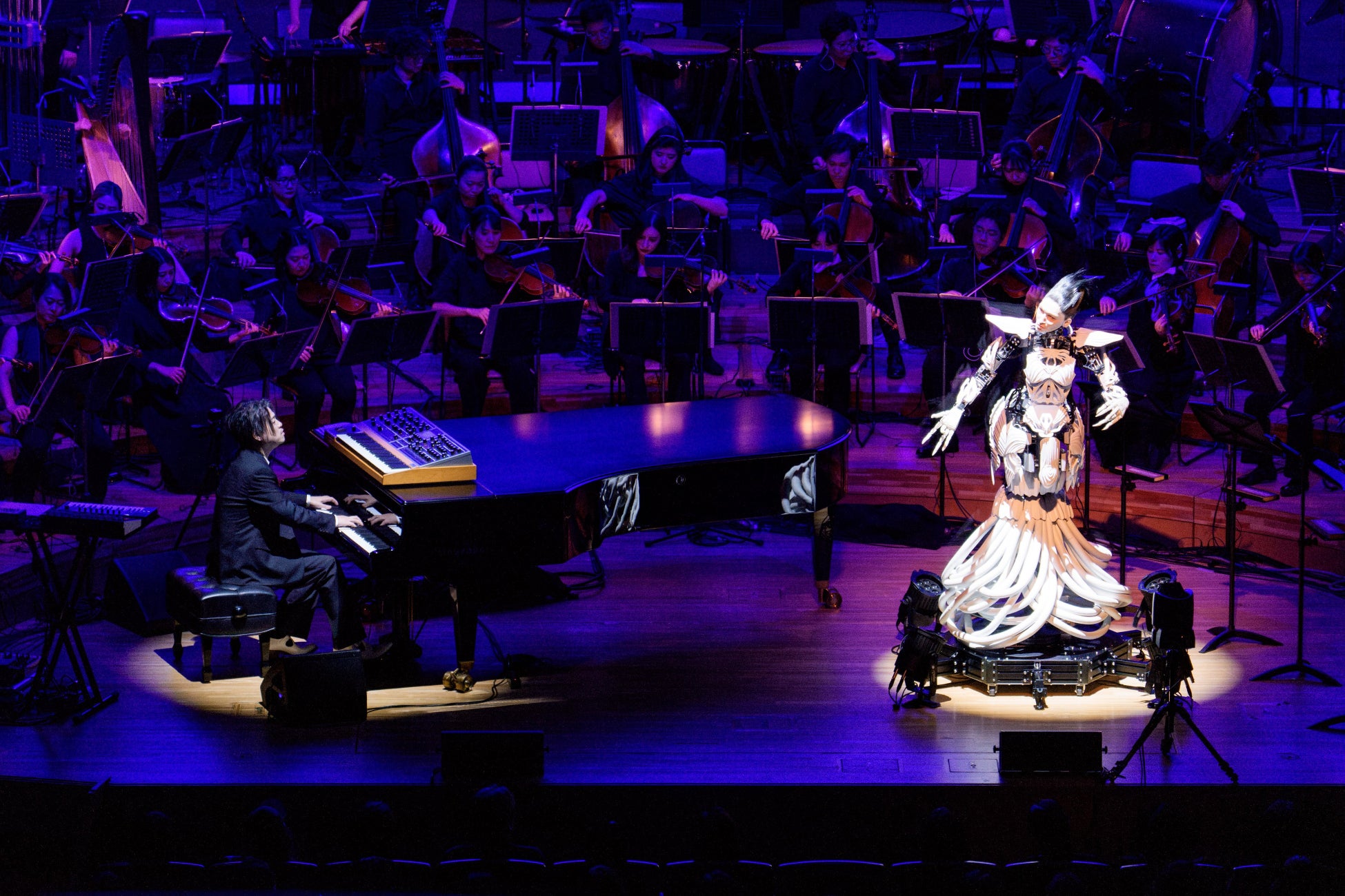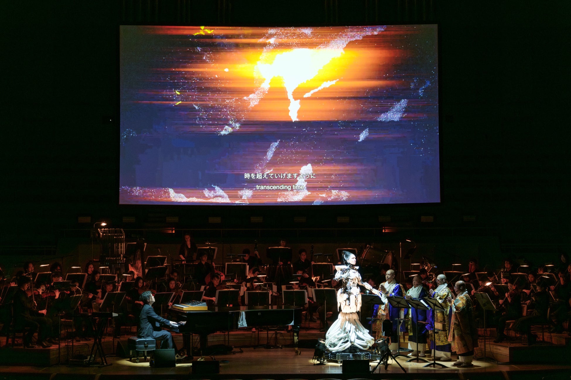 ステージには、渋谷の亡き妻をモデルとした「アンドロイド・マリア」が初登場、歌唱を披露。気鋭のヴァイオリニスト成田達輝をコンサートマスターに迎えた62名のスペシャルオーケストラ、藤原栄善を中心とした4人の高野山の僧侶による声明、電子音、リアルタイムでのAI会話など、異なる要素が有機的に融合するなかスペシャルゲストとして、グラミー受賞ベーシストのシャーロット・ケンプ・ミュール(Charlotte Kemp Muhl)も登場して、渋谷、アンドロイド・マリア、僧侶たちとのコラボレーションも披露した。