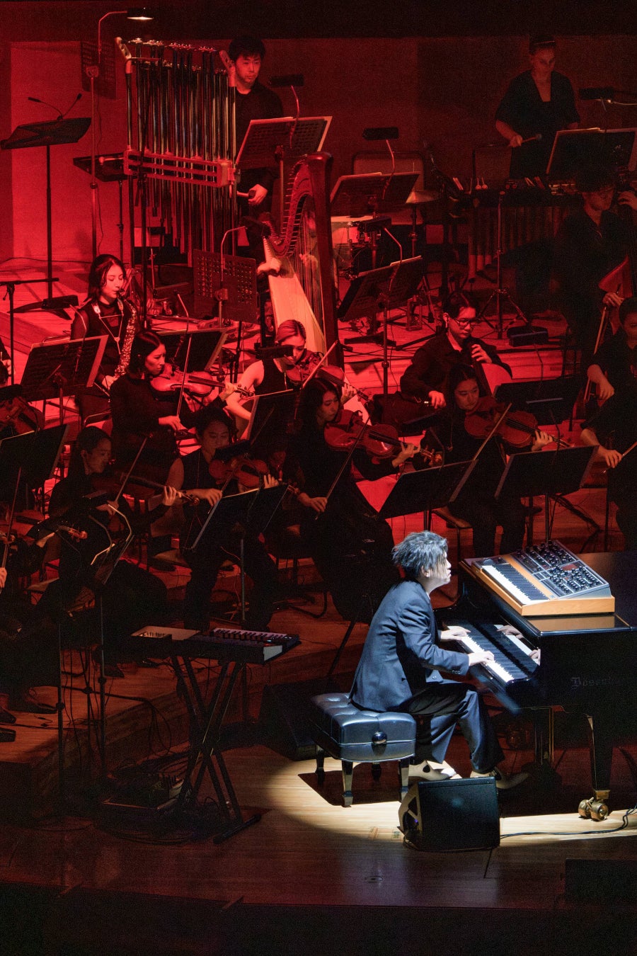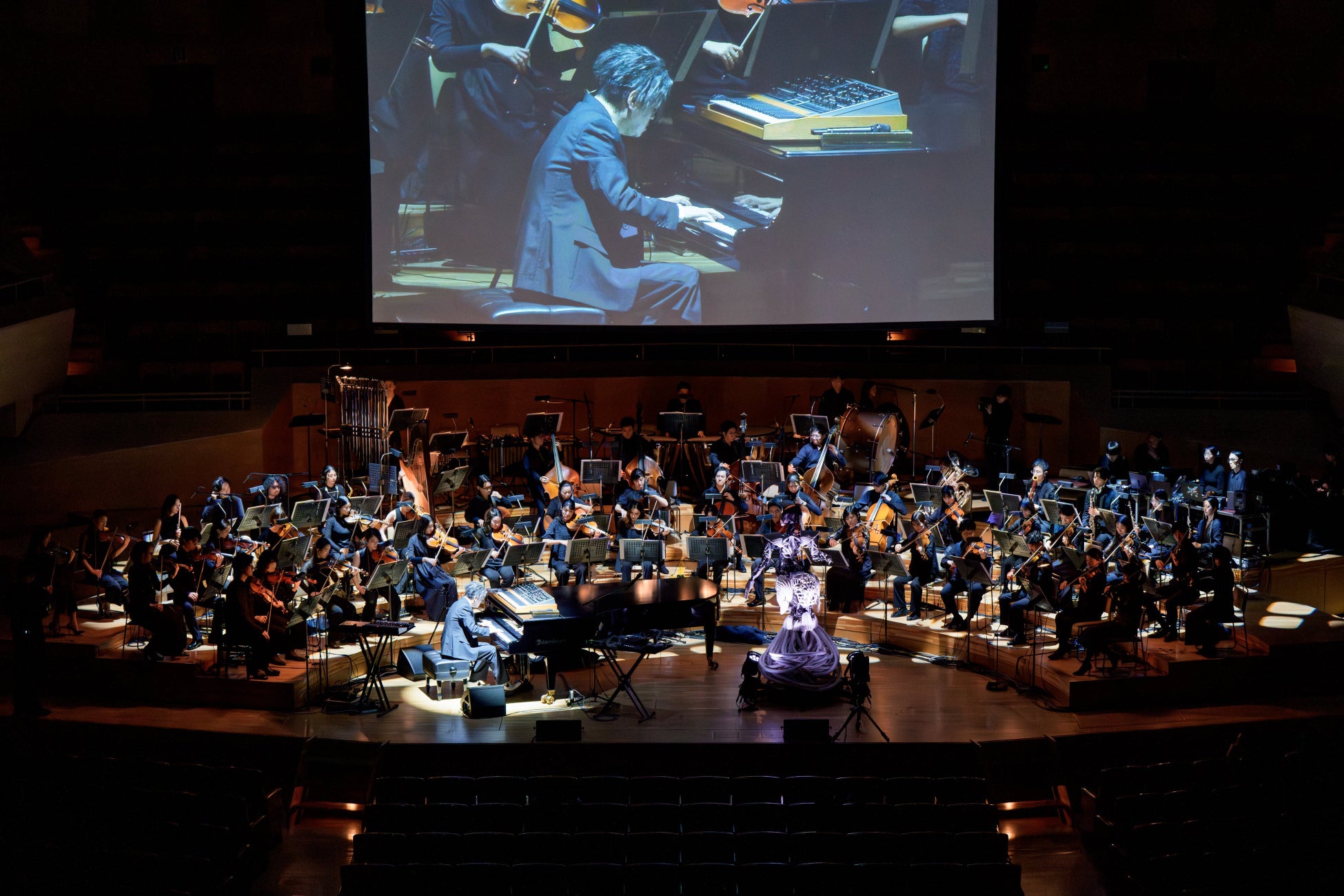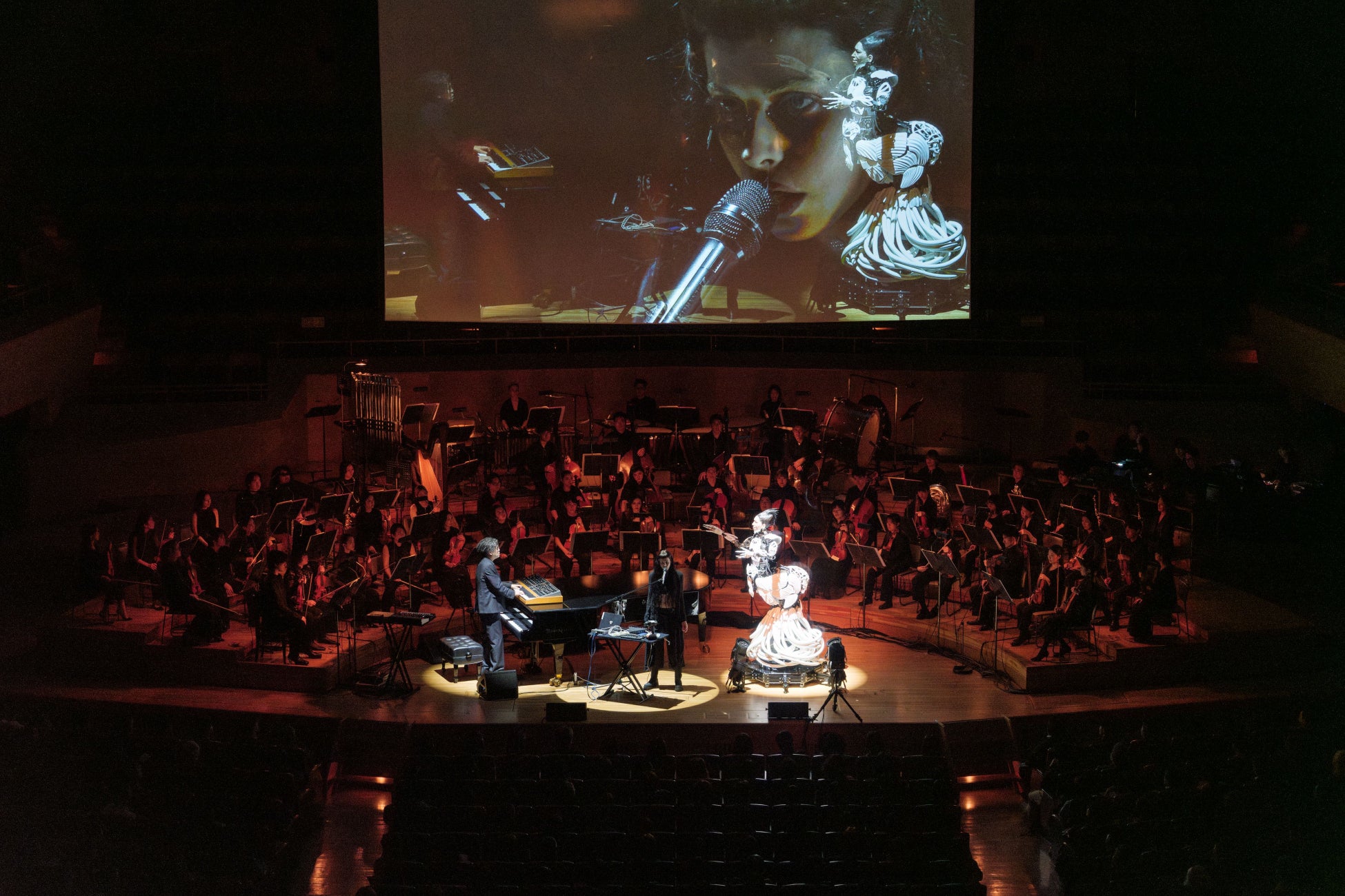 ステージには、渋谷の亡き妻をモデルとした「アンドロイド・マリア」が初登場、歌唱を披露。気鋭のヴァイオリニスト成田達輝をコンサートマスターに迎えた62名のスペシャルオーケストラ、藤原栄善を中心とした4人の高野山の僧侶による声明、電子音、リアルタイムでのAI会話など、異なる要素が有機的に融合するなかスペシャルゲストとして、グラミー受賞ベーシストのシャーロット・ケンプ・ミュール(Charlotte Kemp Muhl)も登場して、渋谷、アンドロイド・マリア、僧侶たちとのコラボレーションも披露した。