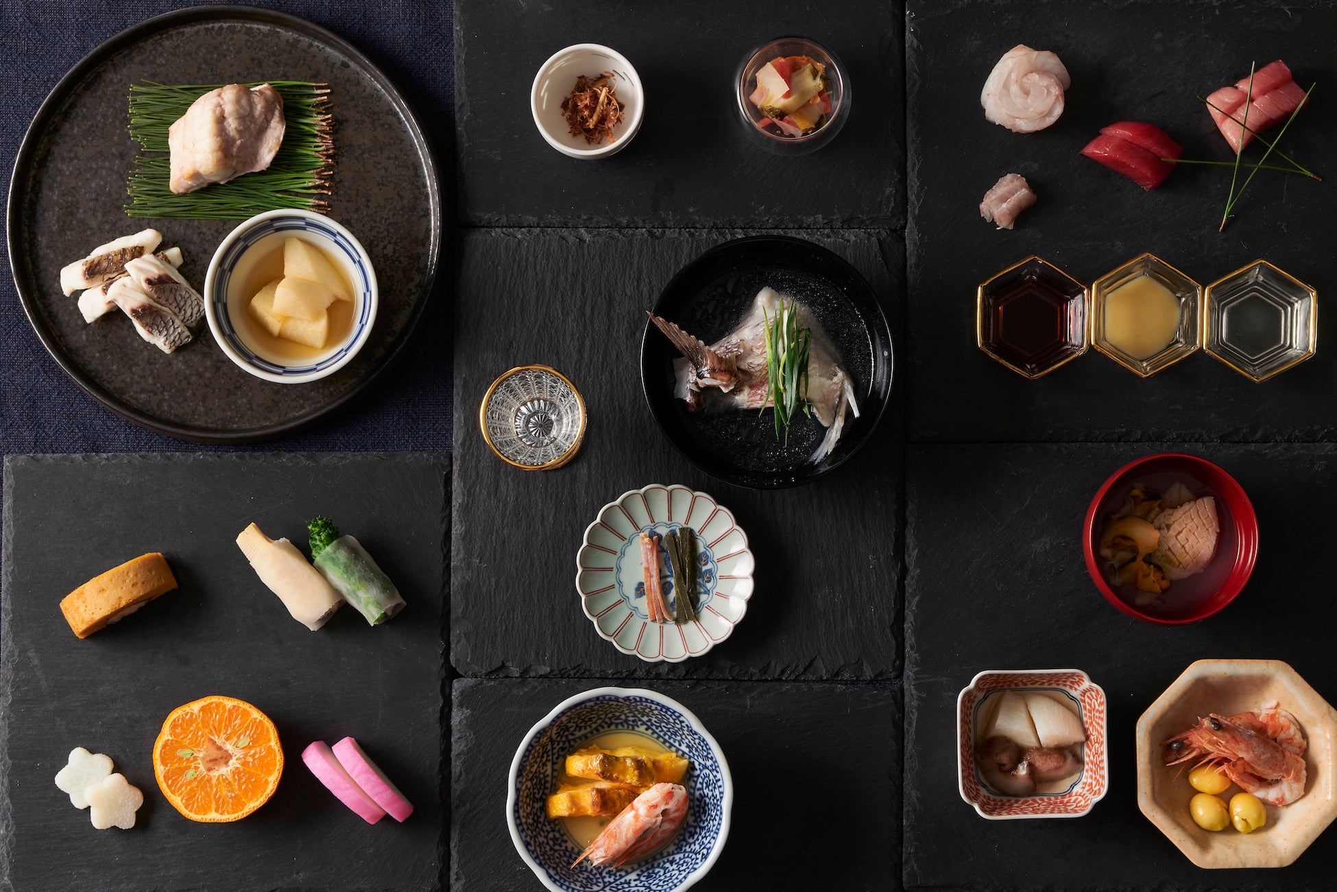 当コースは1週間前までの完全予約制です。江戸時代と同じく国産の素材のみを使用し、刺身や煮物などの肴など、贅を尽くした全27品の料理を提供。魚介類と野菜を中心としたお祝いの席にぴったりの美しい和食をお楽しみいただけます。