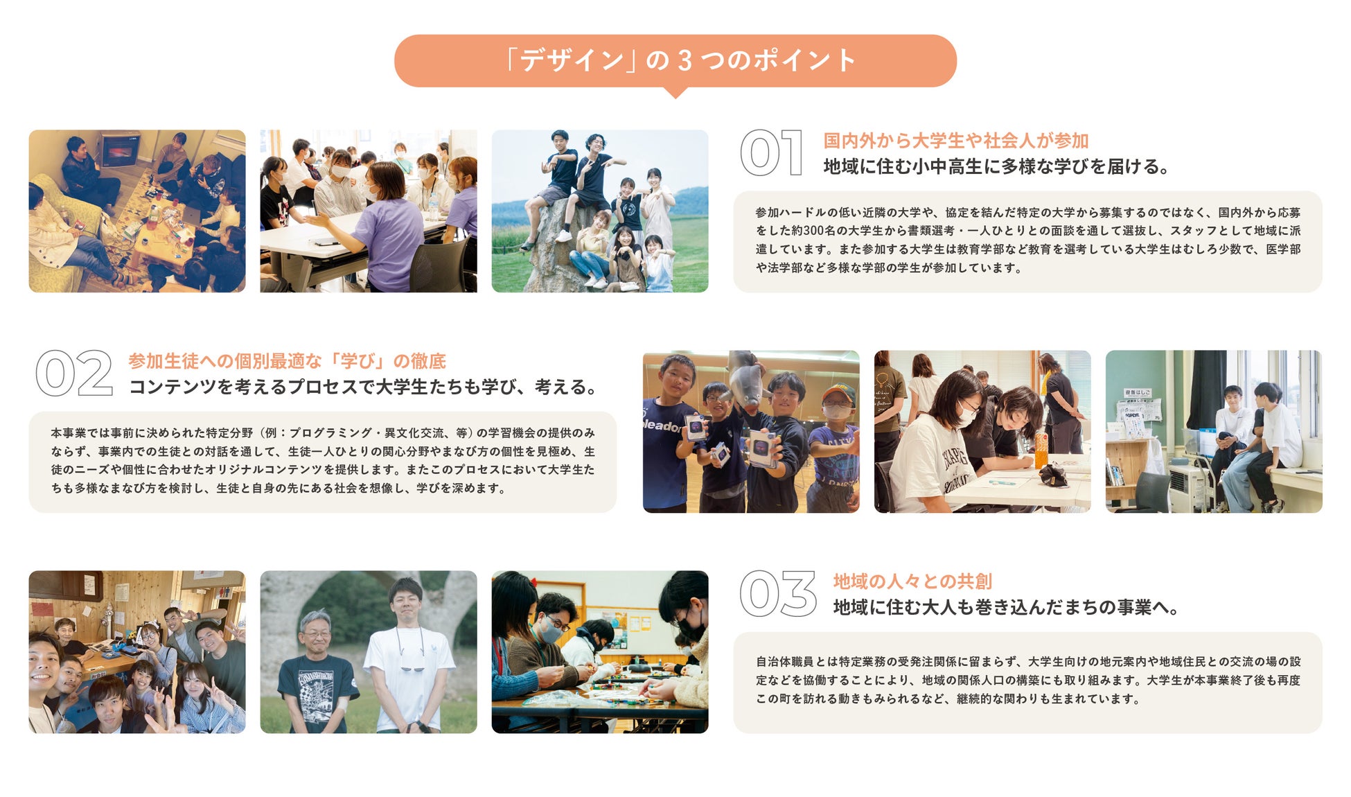 ①国内外から大学生や社会人が参加:地域に住む小中高生に多様な学びを届ける。