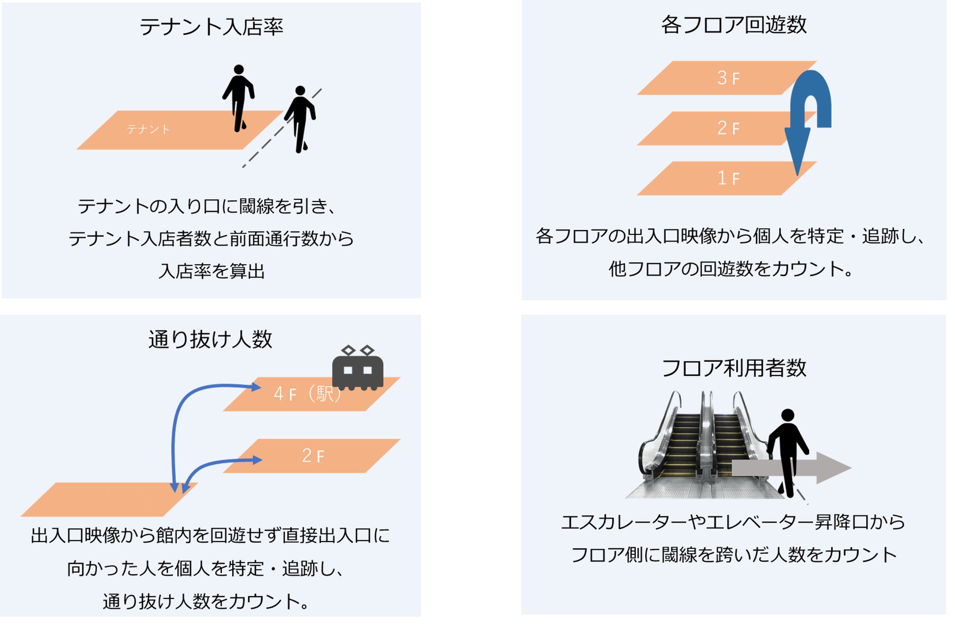 特に、大規模な商業施設などにおいて、個々の顧客の詳細な回遊行動や特定エリアへの関心の度合いを精密に分析し、そのデータを基にした効果的なテナント配置やイベント戦略の策定を支援します。