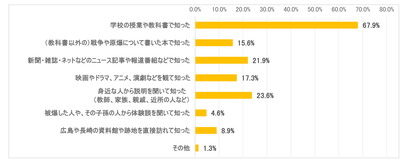 原爆について「知っている」と回答した小・中学生に「どのように原爆のことを知りましたか」と質問したところ、1位「学校の授業や教科書で知った」が約7割(67.9%)と圧倒的に多く、2位「身近な人から説明を聞いて知った(教師、家族、親戚、近所の人など)」(23.6%)、3位「新聞・雑誌・ネットなどのニュース記事や報道番組などで知った」(21.9%)と大きな差があった。