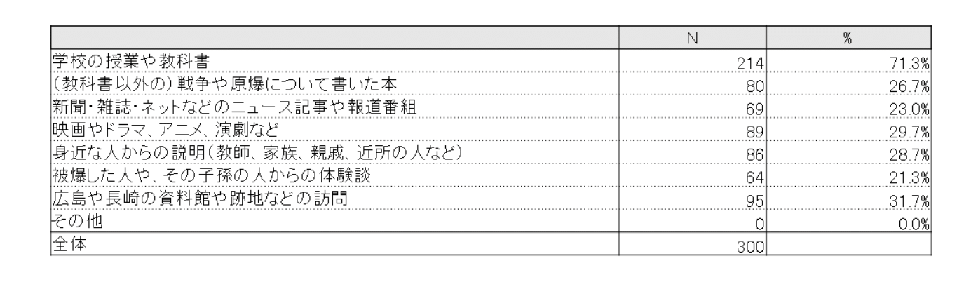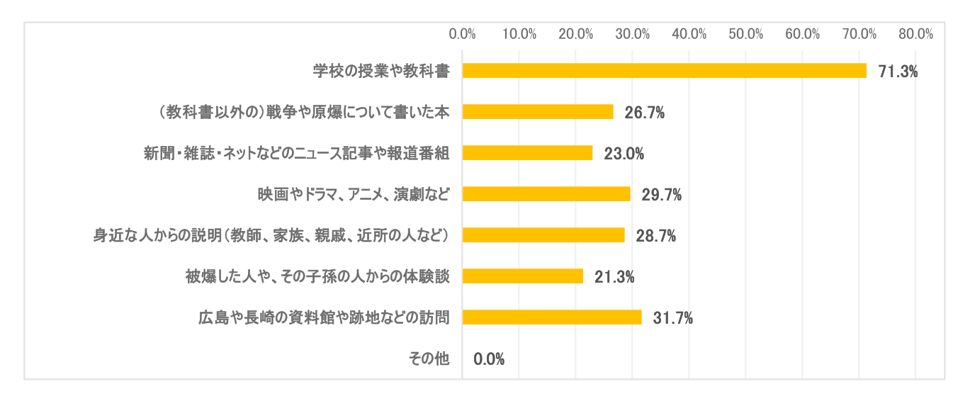 「被爆した人や、その子孫の人から体験談を聞いて知った」(4.6%)、「広島や長崎の資料館や跡地を直接訪れて知った」(8.9%)は、ともに10%未満となり、被害に遭った人や場所に直接触れて知る機会は非常に少ないことがわかった。