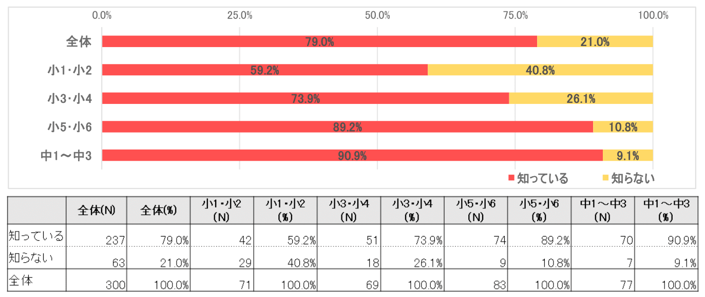 学年別にみると、小1・小2では6割弱(59.2%)、小3・小4では7割強(73.9%)、小5・小6では9割弱(89.2%)、中学生では9割強(90.9%)と、学年が上がるごとに「知っている」とする比率も上昇する結果となった。