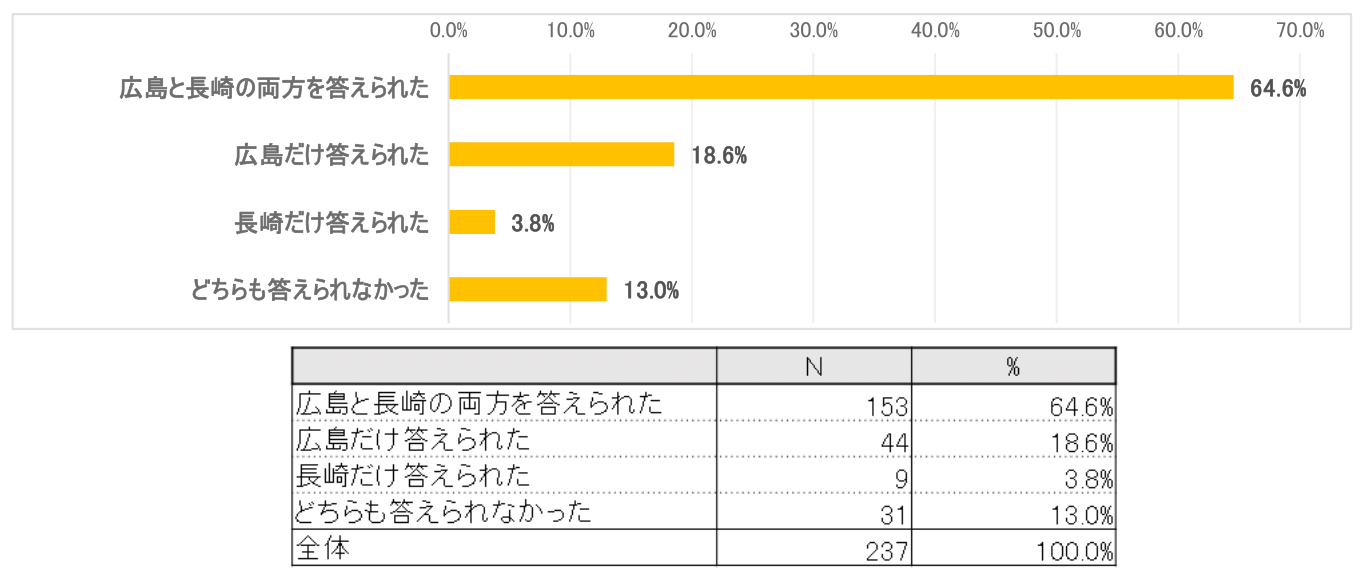 「広島だけ」(18.6%)、「長崎だけ」(3.8%)を答えられた数も合わせると87.0%となり、9割近くが原爆が投下された場所を認識していた。
