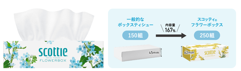 ※当社調べ:一般的なボックスティシュー150組とスコッティ フラワーボックス250組の比較