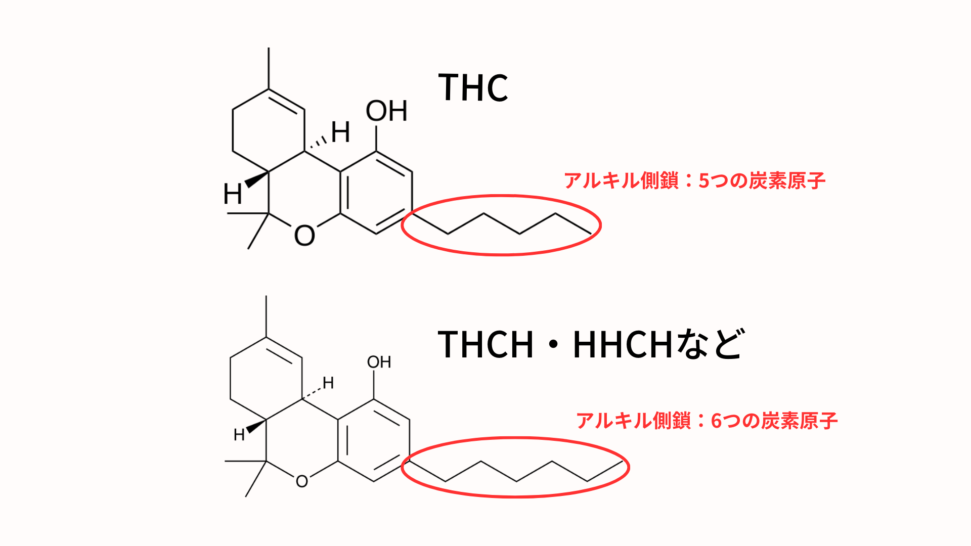 THCとこれらの物質の化学構造を比べると、アルキル側鎖という部分において、THCは5つの炭素原子を持つのに対し、THCHやHHCHは6つの炭素原子を持ちます。