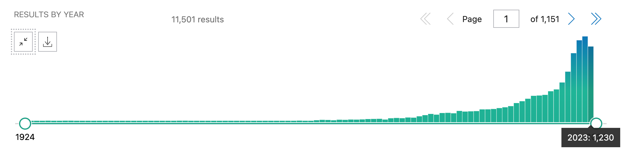 CBDの研究論文数の推移。2023年だけでも1,230本、合計で約11,500本が投稿されている。