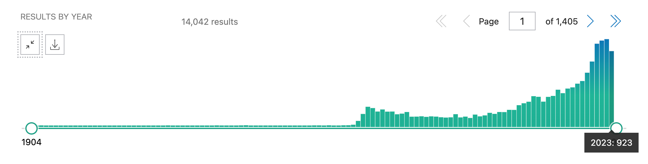 THCの研究論文数の推移。2023年だけでも923本、合計で約14,500本が投稿されている。