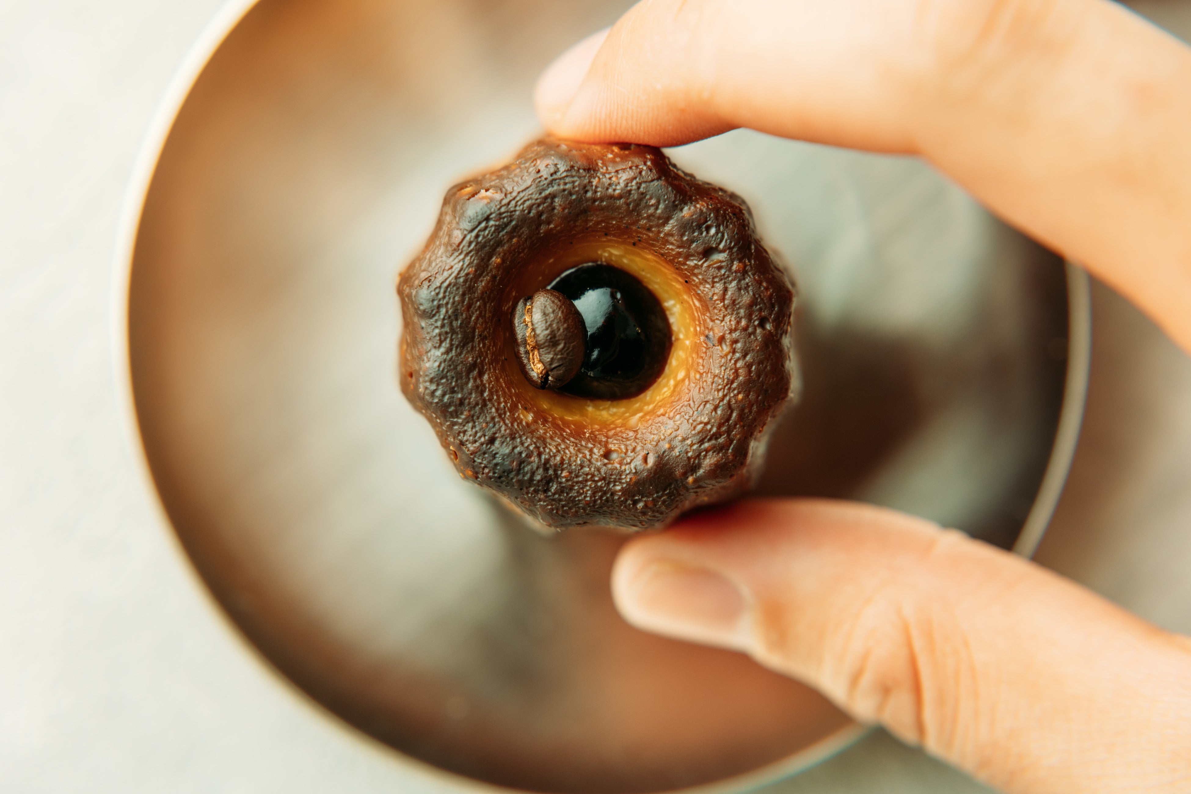「オリジナルコーヒーカヌレ」は、シンプルながらバニラの優しい甘さが心地良く楽しめる「GINZA Corridor Cannelé」と同じレシピを生地に採用し、そこに「JOE TALK COFFEE」こだわりのエスプレッソを贅沢に使用した濃厚なコーヒークリームを流し込みました。深煎りコーヒーの香りとコク、そしてビターで大人の上品な味わいを引き出します。