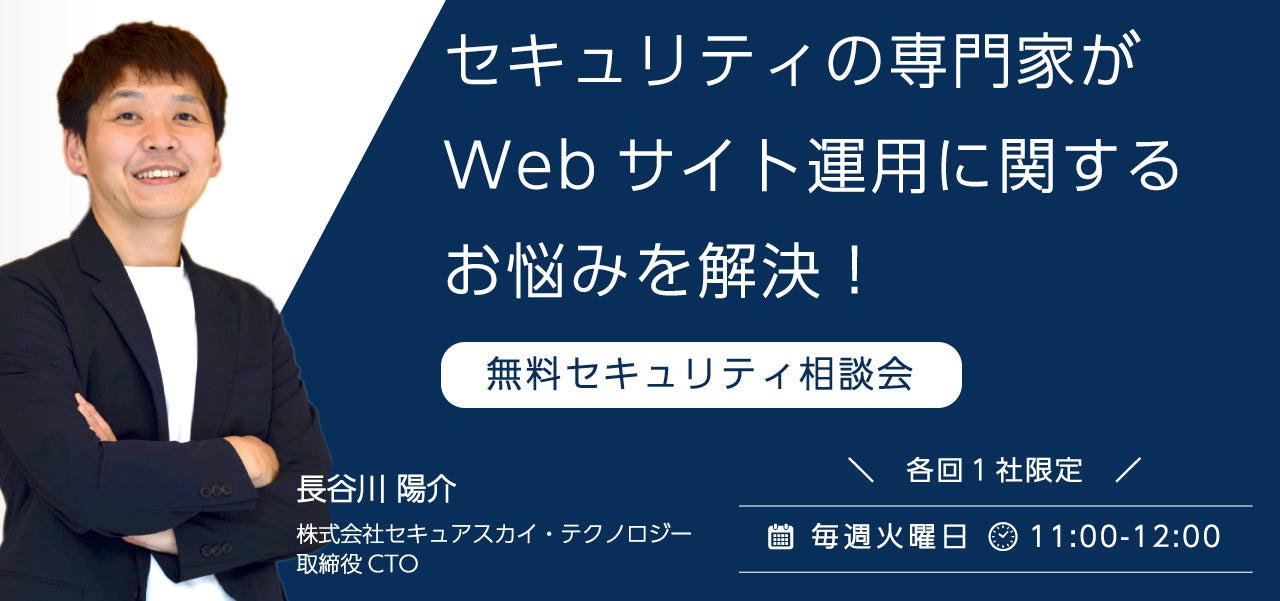 Webサイトでビジネスを行う企業・団体において、セキュリティ対策は信頼性や事業継続の重要な要素となっています。しかしながら、多くの企業・団体がセキュリティ課題に直面し、その解決策に悩んでいるケースも少なくありません。本相談会は、セキュリティに関するお悩みを抱える方、そしてセキュリティに関する幅広いテーマについて相談したい方を対象にしています。SSTの取締役CTOであり、セキュリティ業界の多方面で活躍する長谷川陽介が、最新の知識と経験に基づいて、お客様のビジネスに合わせた課題分析やアドバイスを提供します。
