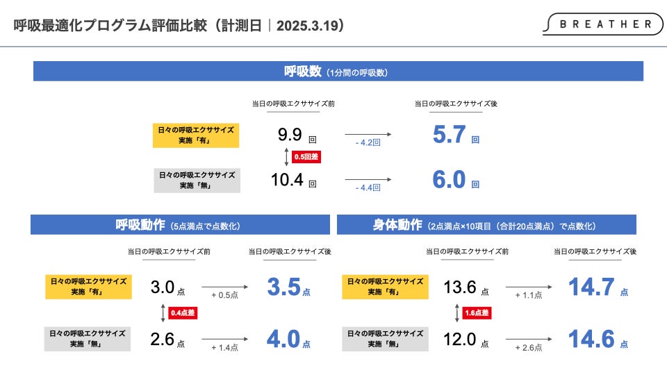その取り組みの一環として、呼吸最適化プログラムの中間効果測定を実施し、測定の結果、選手の呼吸数、呼吸動作、身体動作が改善する結果となりました。