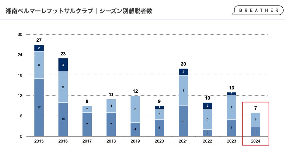 さらに、2024-25シーズンにおいては、過去10シーズンで最も離脱者が少ないシーズンとなり、スタッフ陣からも呼吸最適化プログラムの感想として、「怪我人が減った」ことを数値としても実感いただきました。湘南ベルマーレフットサルクラブトレーナーの府川俊一朗氏と呼吸最適化プログラムを監修している大貫崇氏より、以下コメントをいただきました。