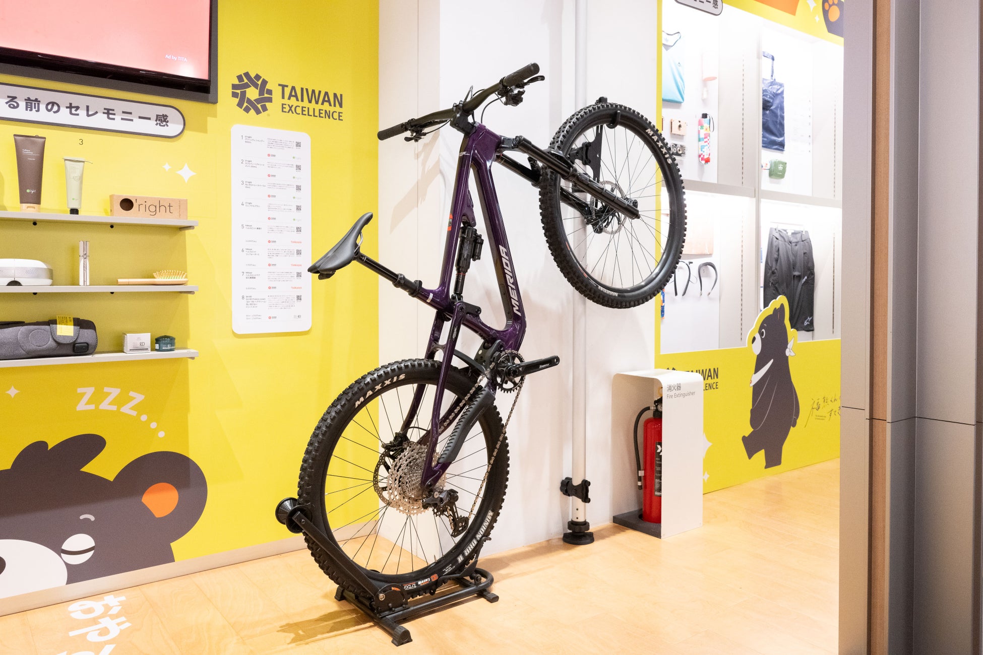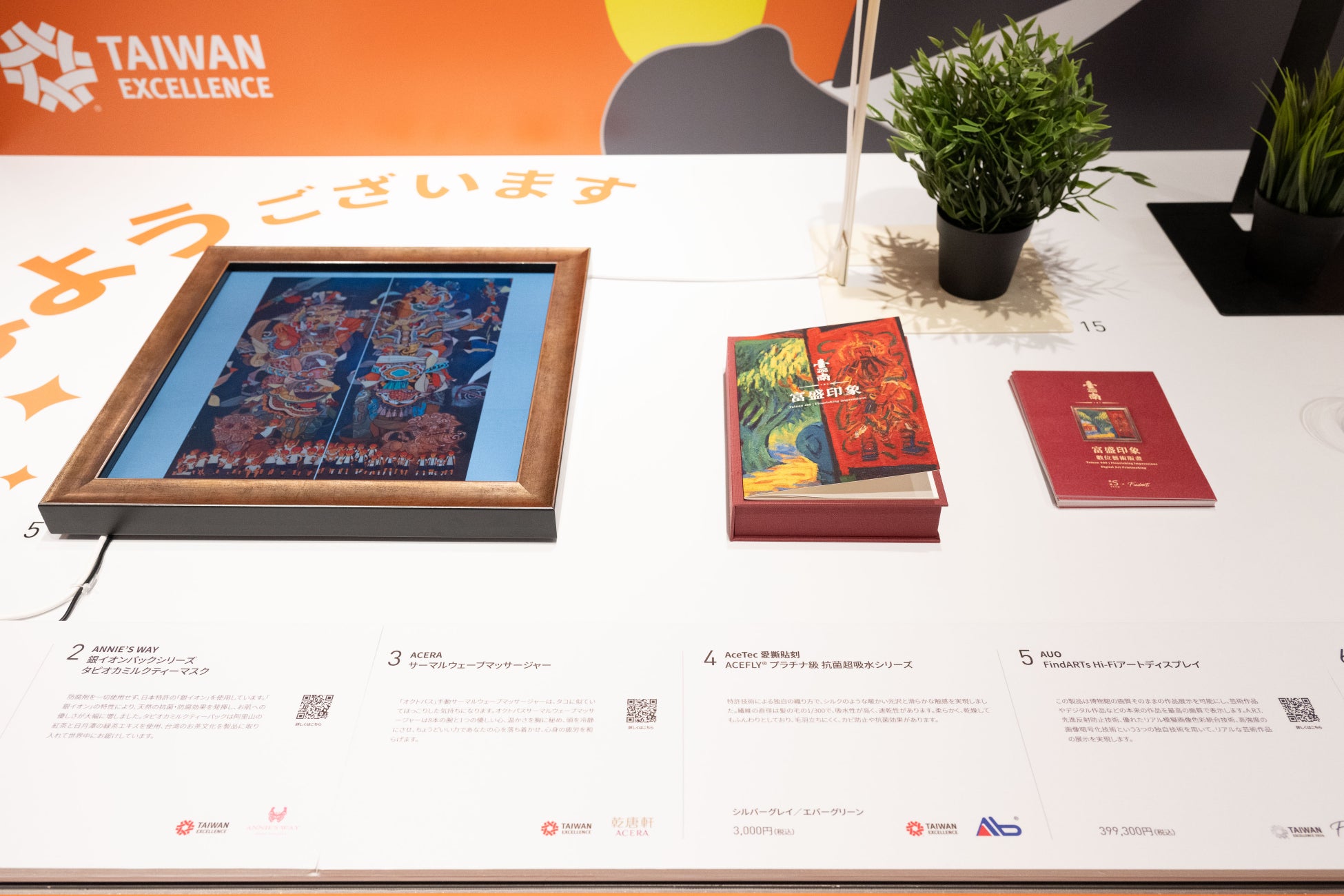 また、以下の3つの台湾エクセレンス銀賞を受賞した商品も展示されています。外出時に環境に優しく便利で健康的な自転車「MERIDA」ONE-SIXTY 6000や、持続可能な製品「mbranfiltra」ポータブルウォーターフィルター内蔵TPUウォーターバッグ、そして博物館級の画質で作品展示が可能な「AUO」FindARTs Hi-Fiアートディスプレイです。