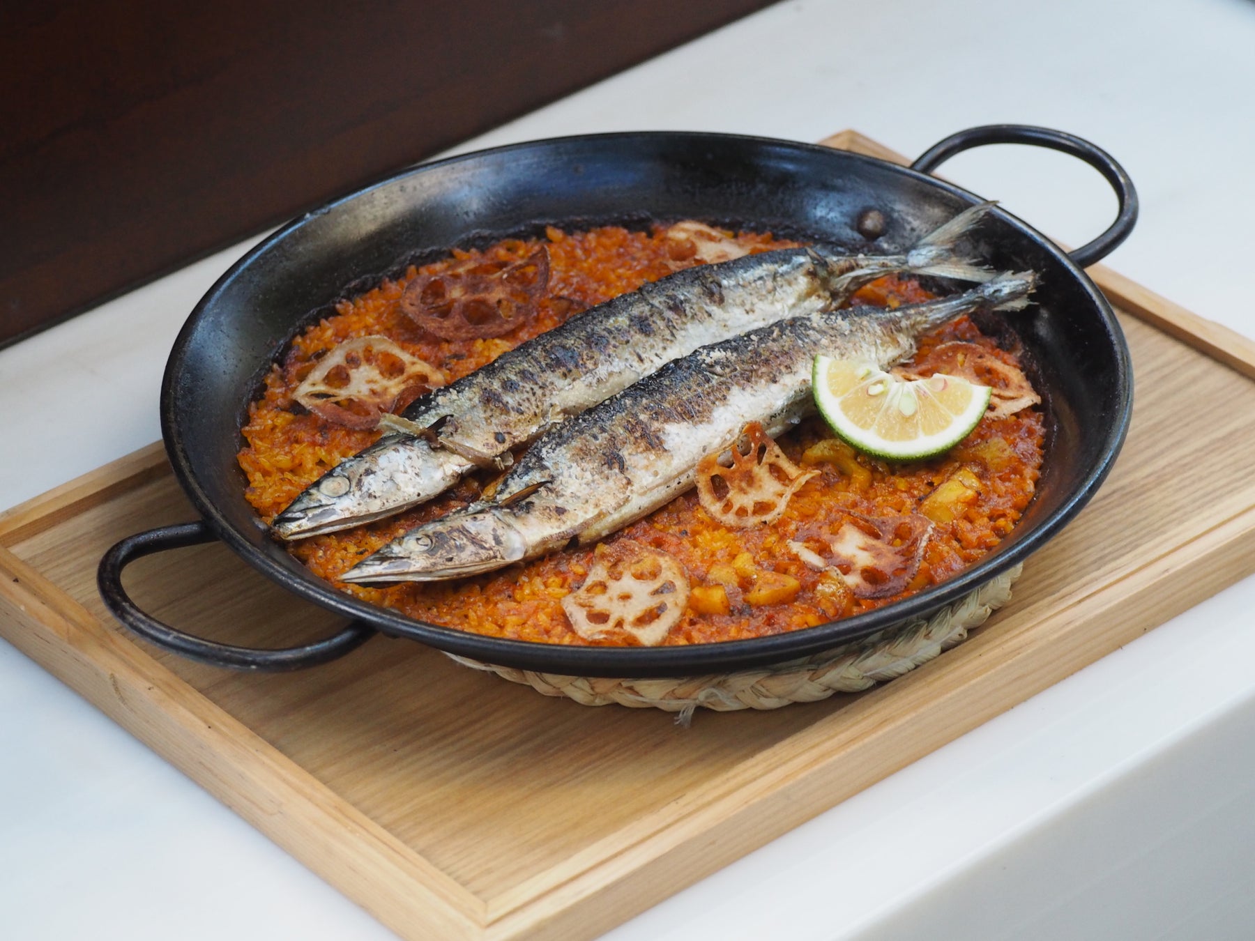 今回ご紹介する新メニューは秋の味覚「秋刀魚」を丸ごと2匹のせた【新秋刀魚を丸っと2匹使用した豪快パエリア】