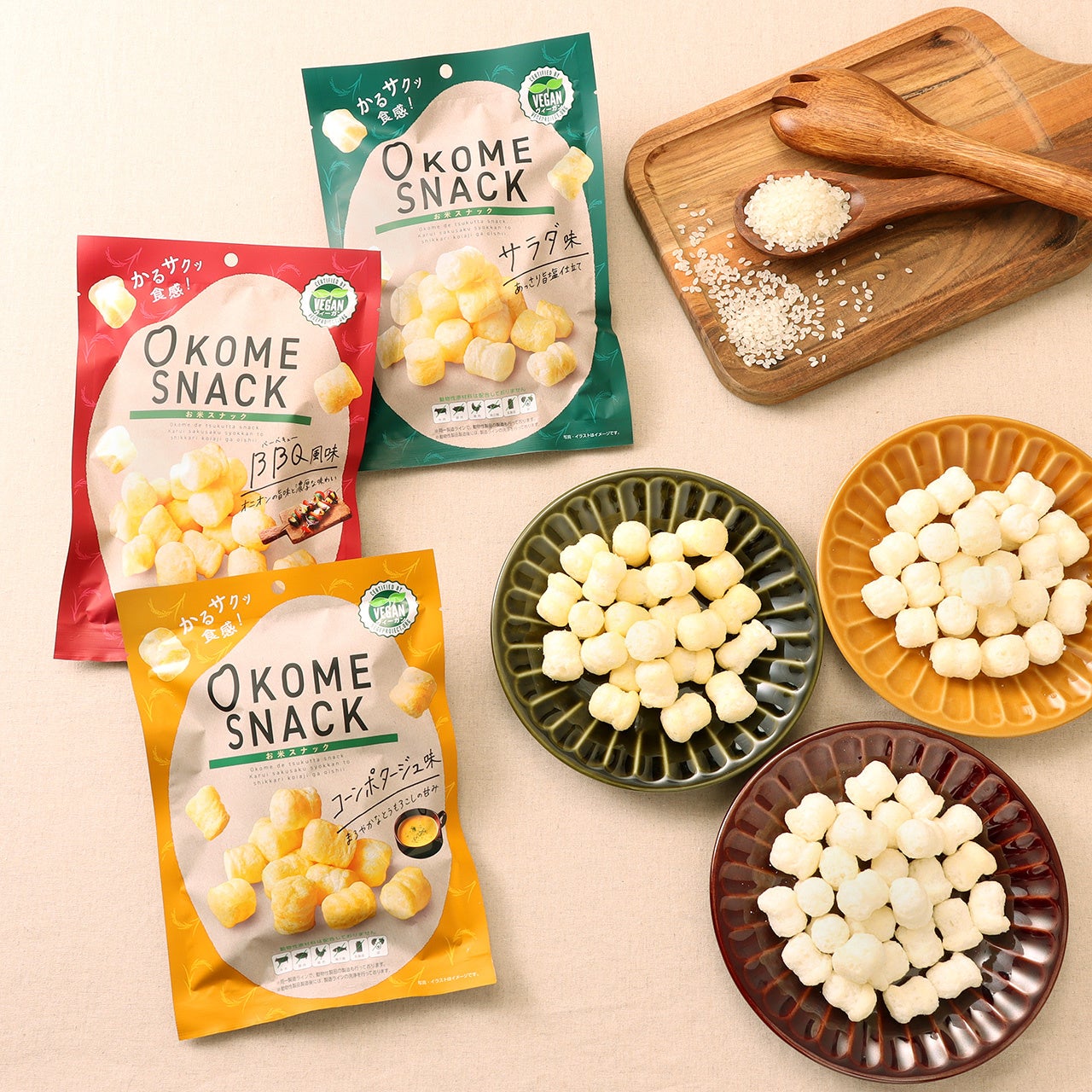 お米スナックは、揚げ油を用いず、ノンフライ製法で作ったヘルシーなスナックです。動物性原材料は使用せず、主原料のお米は、国産にこだわり、しっかりとお米の味が感じられ、サクサクとした軽い食感、口溶けの良さが特徴です。サラダ味、バーベキュー風味、コーンポタージュ味の3種類の味を用意しました。