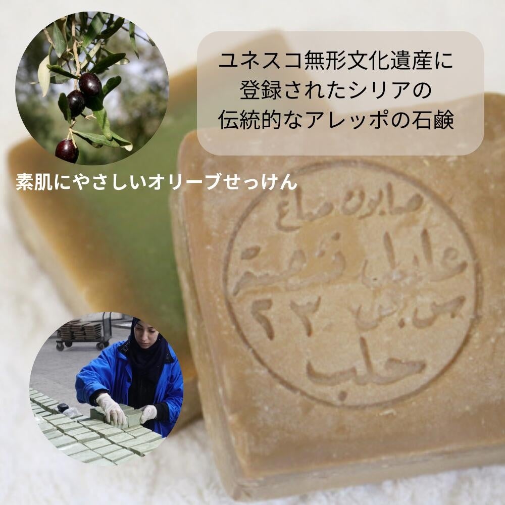 また、オーガニックコットンタオルと「アレッポの石鹸」を組み合わせたセットもご用意しました。アレッポの石鹸は、シリアで千年以上受け継がれてきた伝統石鹸で、オリーブオイルとローレルオイルを原料とし、防腐剤や着色料を一切使用していません。やさしい泡立ちで、顔・全身・髪まで幅広く使うことができ、赤ちゃんから大人まで安心してお使いいただけます。