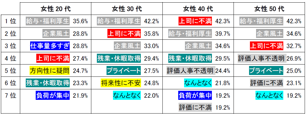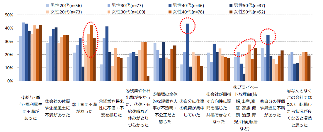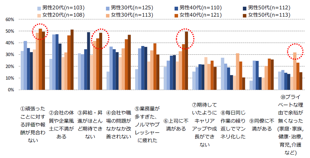 ・ 女性は各年代で「③上司に不満」が上位に挙がる(40代では1位)。その他には「⑤残業や休日出勤の多さ・休みのとりづらさ」「⑨プライベートな理由」というワークライフバランス関連も挙がる。男性でも30代で「⑨プライベートな理由」、50代で「⑤残業や休日出勤の多さ・休みのとりづらさ」がランクインする。