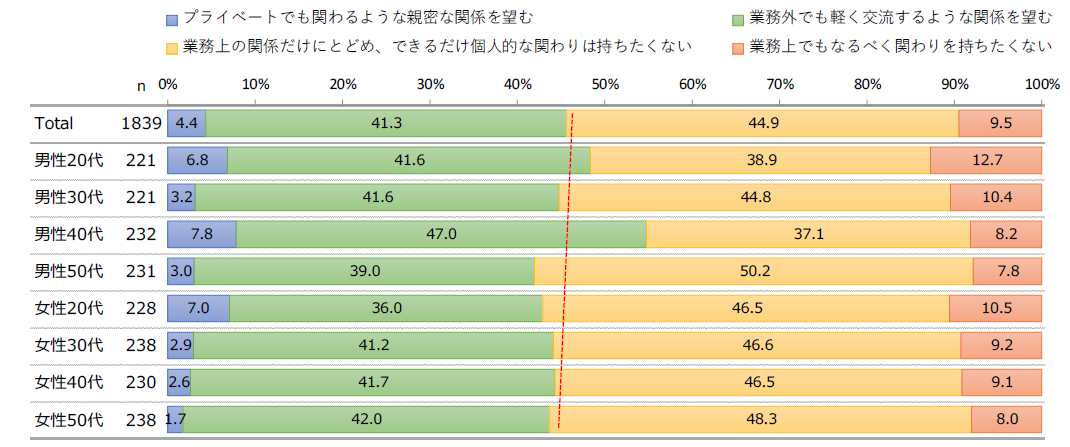 職場の人とプライベートや業務外でも交流するような関係を望むのは全体の45.7%。一方、「業務上の関係だけにとどめ、できるだけ個人的な関わりは持ちたくない」と「業務上でもなるべく関わりを持ちたくない」を合わせると、職場の人とは「あまり関わりたくない」と考える人は54.4%で過半数を占めます。