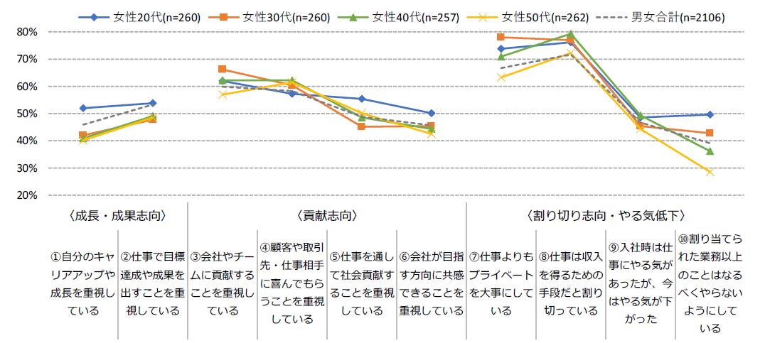 女性では、20代で「①キャリアアップや成長」を重視、30~50代で〈成長・成果志向〉が低めです。女性20~40代は〈割り切り志向〉が高めで、特に20代では「⑩割り当てられた業務以上のことはなるべくやらない」割合が高いです。(なお、男女ともに若年層が割り当てられた業務以上のことをやらない背景には、転職意向が関係していることを8月4日配信のプレスリリースで紹介しています)