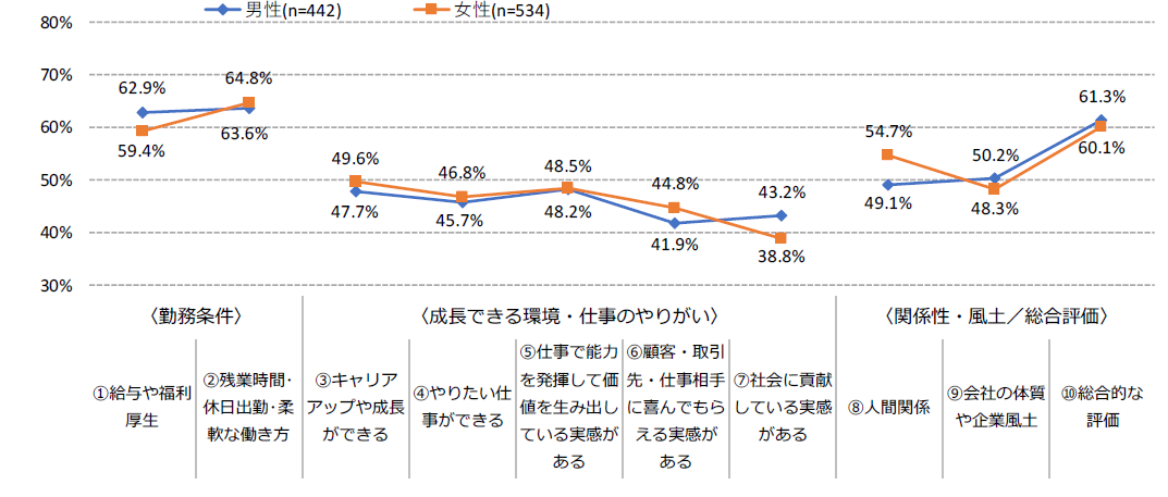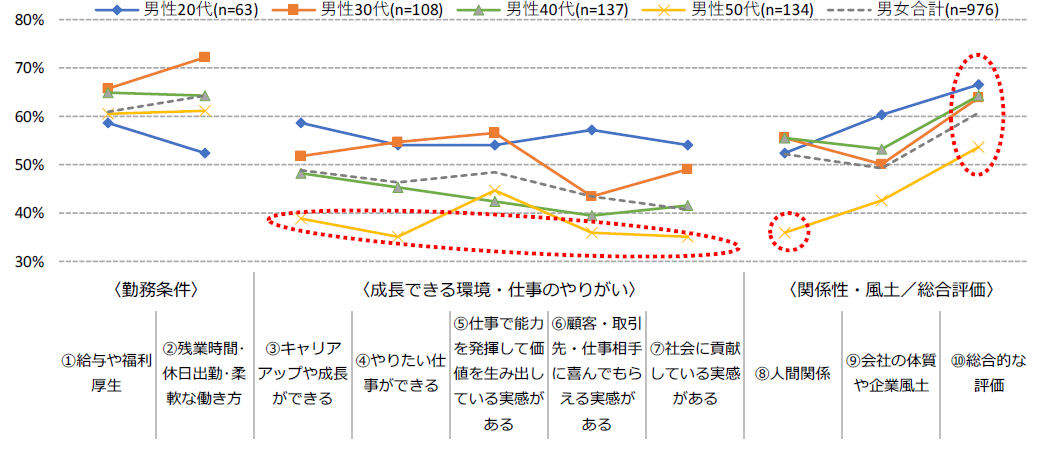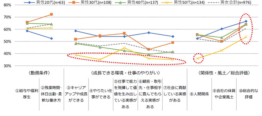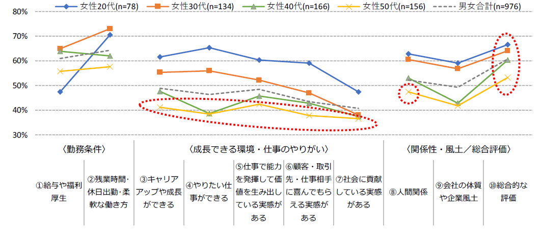 ・ 男女50代では、〈成長できる環境・仕事のやりがい〉のほか、「⑧人間関係」「⑨会社の体質や企業風土」の評価も低い。特に男性50代の「⑧人間関係」は30%台にとどまる。