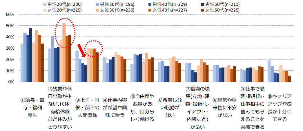 ・ 女性30代の「②残業や休日出勤が少ない、休みがとりやすい」が突出している。「①給与・賞与・福利厚生」「③上司・同僚・部下の人間関係」なども高い。女性40代もそれに準じる。