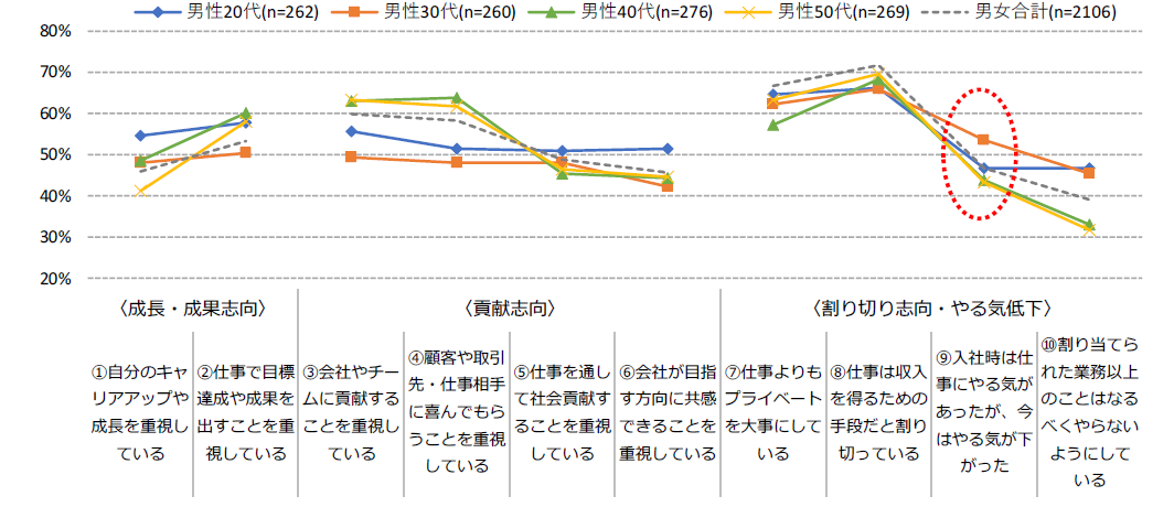 性別に年代を掛け合わせました。男性30代は「⑦プライベート」重視や「⑧仕事は収入を得る手段」の割合が他の年代や女性に比べて高くないにもかかわらず、〈貢献志向〉が低めで「⑨やる気が下がった」割合が高いという特徴があります。男性20~30代には「⑩割り当てられた業務以上のことはなるべくやらない」傾向が比較的見られます。男性20代の結果からは「③会社やチーム」「④顧客や取引先・仕事相手」への貢献よりも自身の「①キャリアアップや成長」を重視していることもうかがえます。
