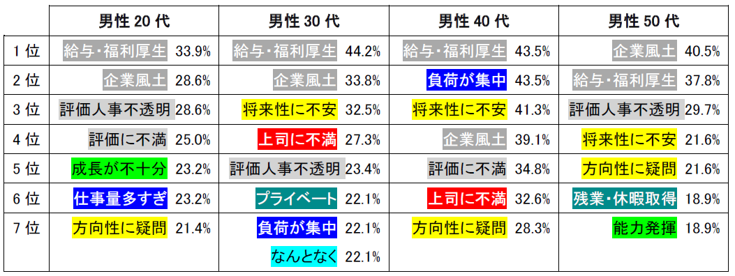 ・ 男性20代で「(自分の)成長が不十分」、男性30代以上で「④将来性に不安」が上位に挙がる(男性40~50代は「⑧方向性に疑問」も上位)。男性40代の「⑦負荷が集中」「⑩自分の評価に不満」が突出。