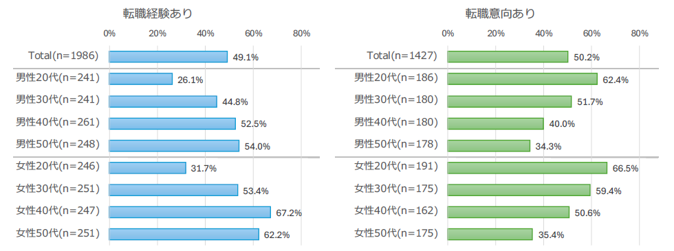 ※転職経験は「5回以上転職」から「1回転職」までの合計、転職意向は「1年未満に転職」から「10年以上先に転職」までの合計、それぞれ「その他」「分からない・答えられない」を選択した回答者を除く