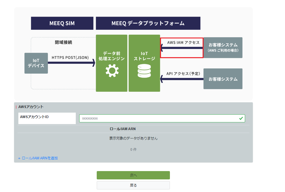 - すでにAWSを利用中の方は、利用開始時にアカウントIDやユーザー/ロール ARNを入力することで、お客様のAWS環境からIoTデータストレージにアクセスできるようになります。