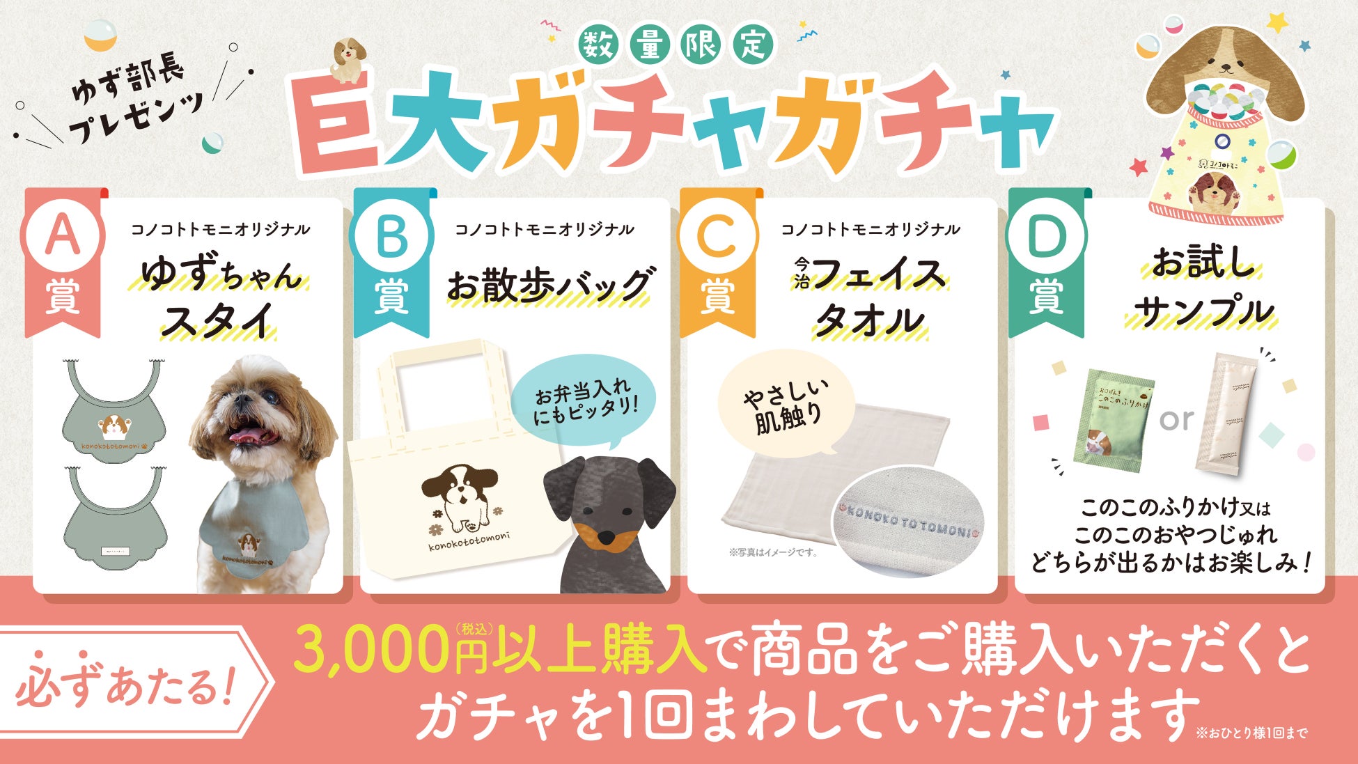 今年もハズレなしの巨大ガチャに加え、新商品「このこのおやつたいむ」5種がインターペットで先行販売。昨年完売した限定お散歩バッグセットも登場!