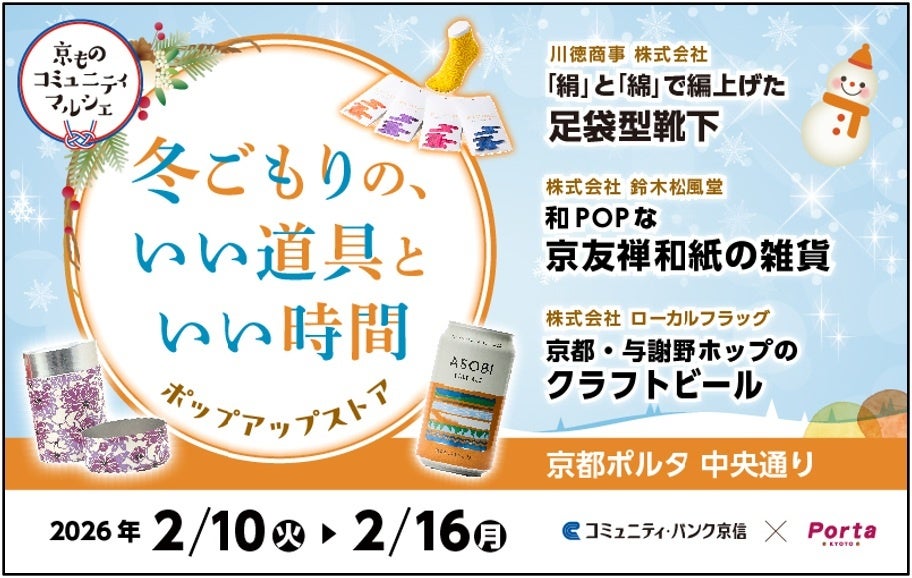 コミュニティ・バンク京信(京都信用金庫 理事長 榊󠄀田隆之)では、地域のさまざまな課題解決に向け、多様なネットワークと地域との関係性を活かしながら、京都を中心とした地域企業の販路開拓支援などに取り組んでいます。また、JR西日本京都SC開発株式会社(代表取締役社長 森本卓壽)が運営する「京都ポルタ」では、地域とともに持続的な発展を実現するため、ポップアップストア開催等を通じて、地域や地域事業者の魅力発信に取り組んでいるところです。