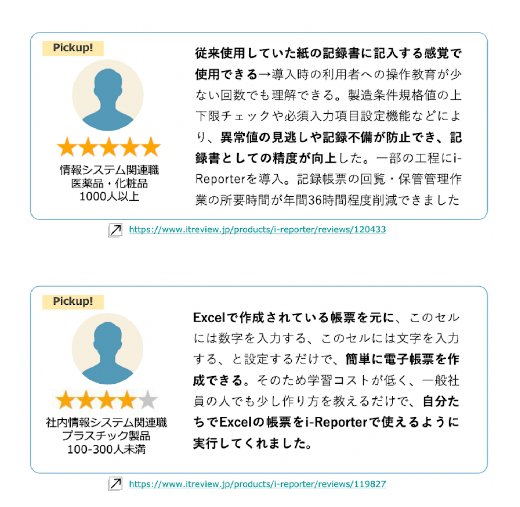 2022年9月時点、国内最大級のIT製品/SaaSのレビュープラットフォーム「ITreview」に寄せられた「i-Reporter」へのレビューは123件あり、その半数近くの49件が「紙帳票をそのまま電子化できる」ことについてご評価頂きました。その他、「労働生産性の向上、省人化が実現できた」など様々な評価を頂いております。